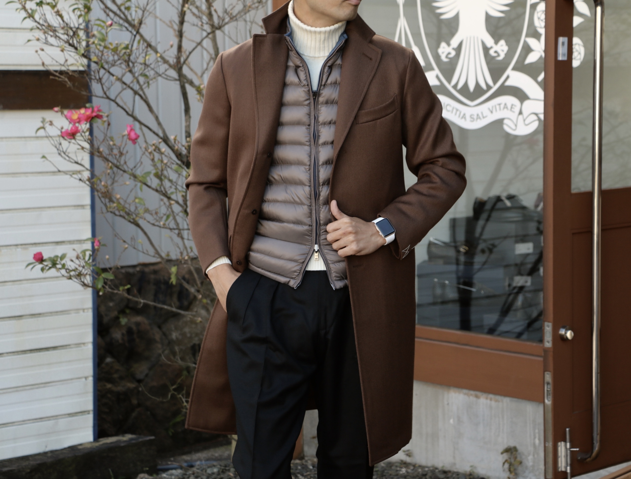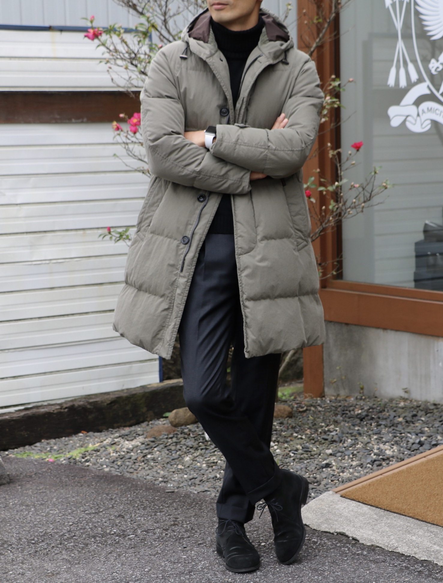 スーツの上にラフに羽織ったのは、【PALTÒ/パルト】のガーメントダイ・ダウンコート。ジャケットに、レザー、肉厚ニット、何の上にでもバサッと羽織れる、気軽なダウンコートでもあります。面積が大きいこともあり、これを羽織るだけで、個性・存在感は十分。着ただけでサマになるコート...というヤツです。