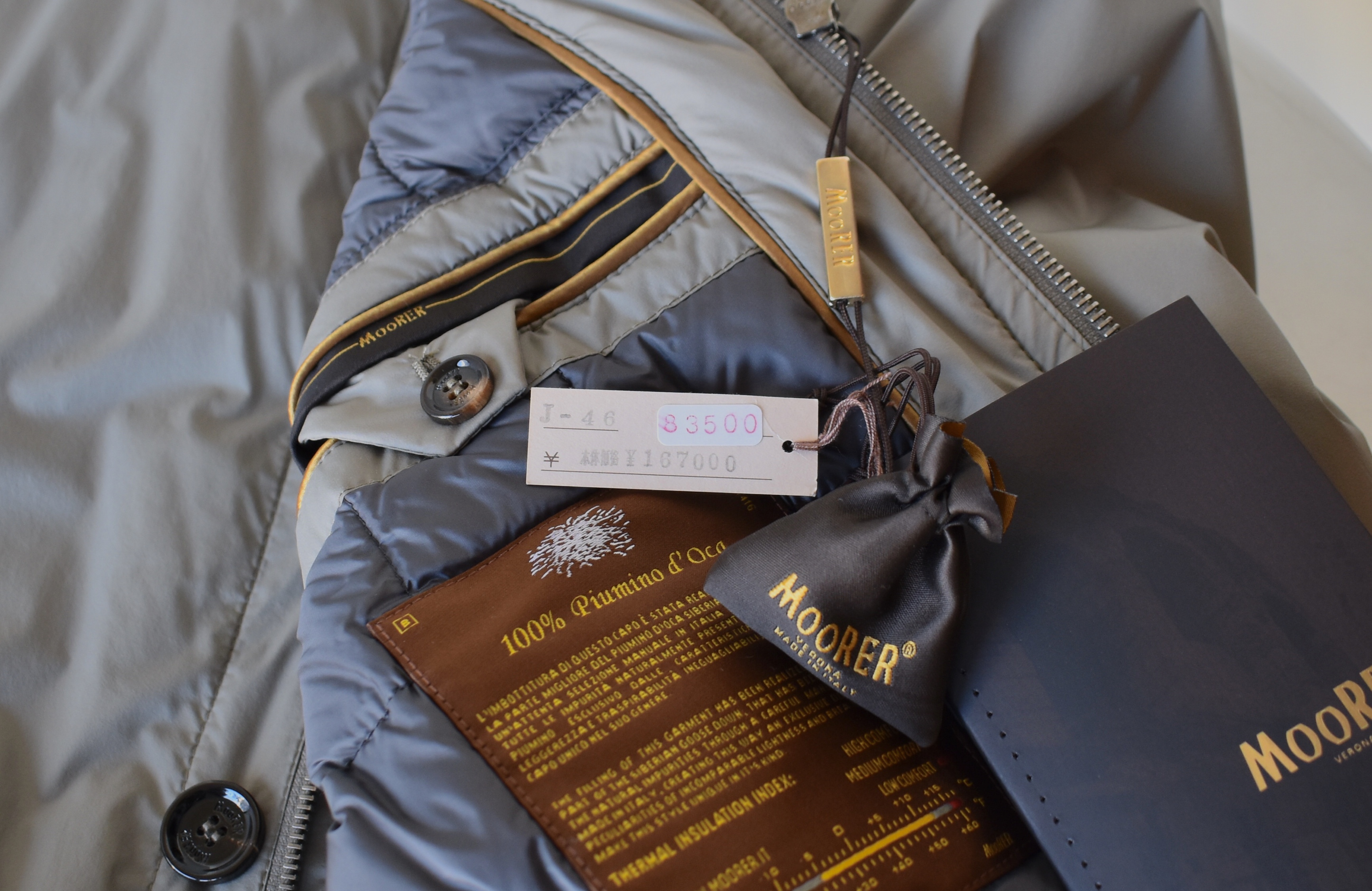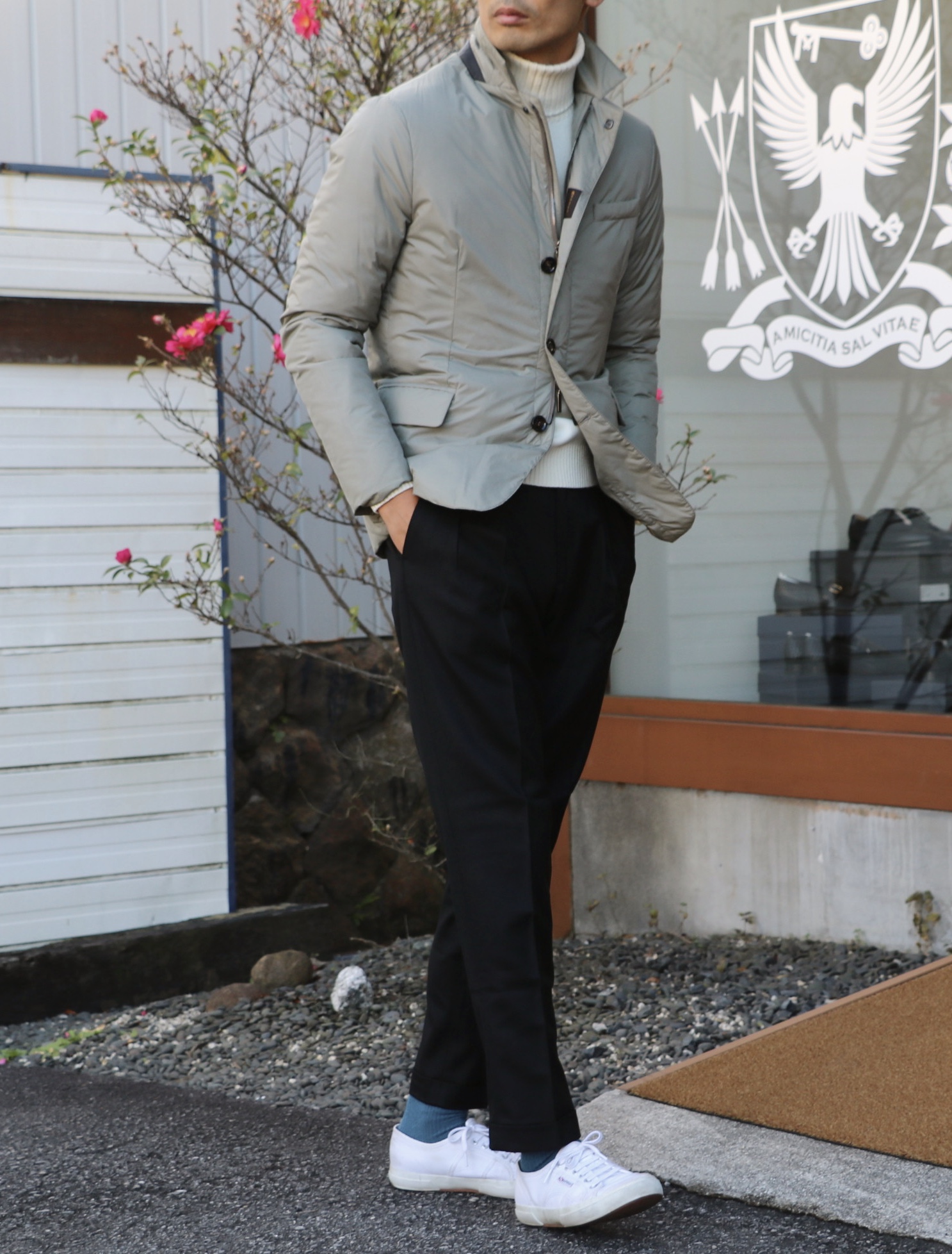 もう1つお見せするのは、MooRER/ムーレーのジャケット型ブルゾン。控えめな雰囲気ながらも、渋い魅力があります。襟を立て、釦は真ん中の一つ掛け、ラフにパンツのポケットにでも手を入れて佇んでいれば、自然とダンディな表情を覗かせるはずです。中には適量のダウンが仕込まれており、アウターとしての機能性は申し分ありません。