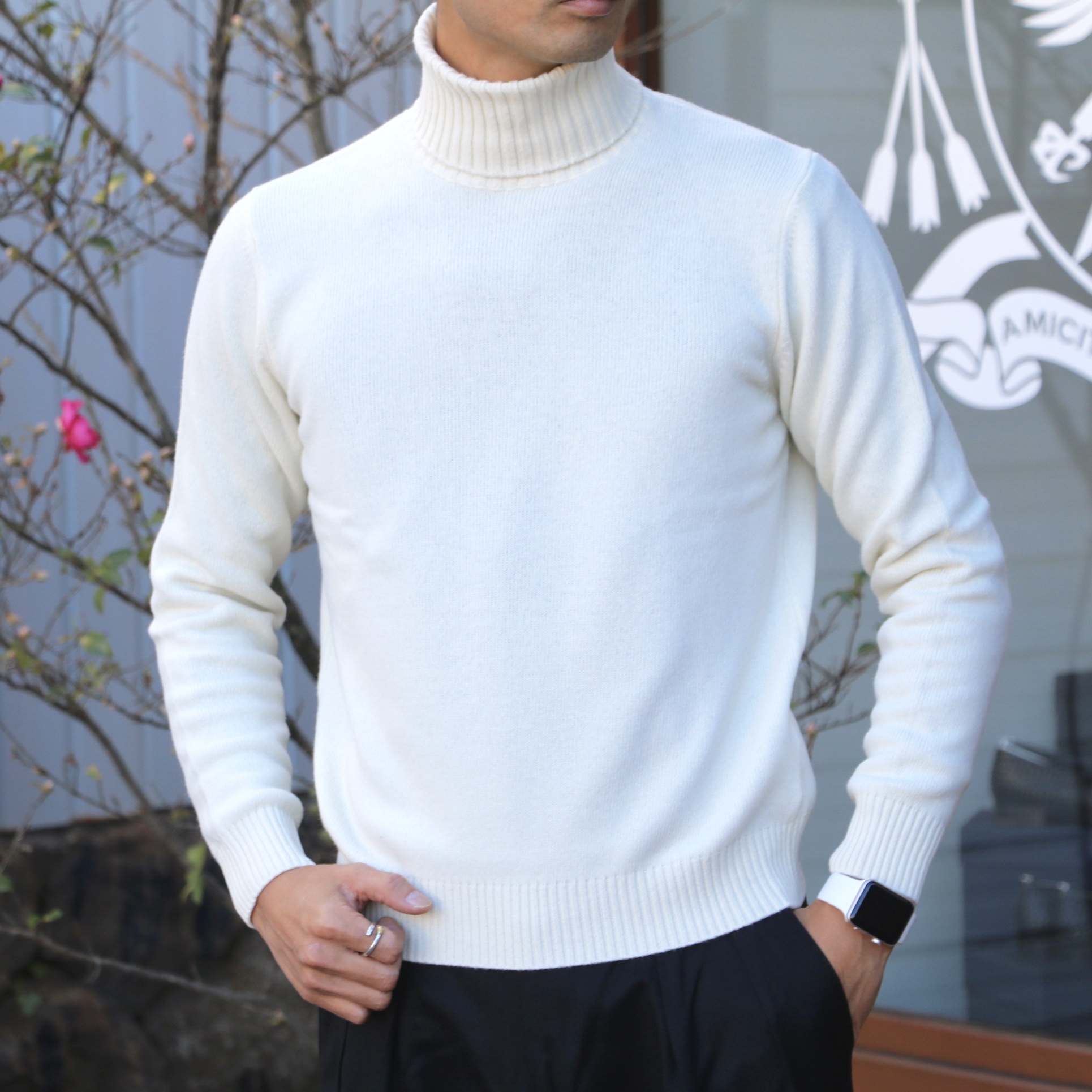 白ニットがお勧めなのは、ハイゲージニットでもまるっきり同じであります。個人的にも白のハイゲージのタートルネックを愛用しております。購入して今年で5年目ですので、所々に汚れも目立ってきましたが、それもたくさん着た証。ジャケットの中に、スーツの中に、レザージャケットの中に...今年もフル回転での着用となりそうです。