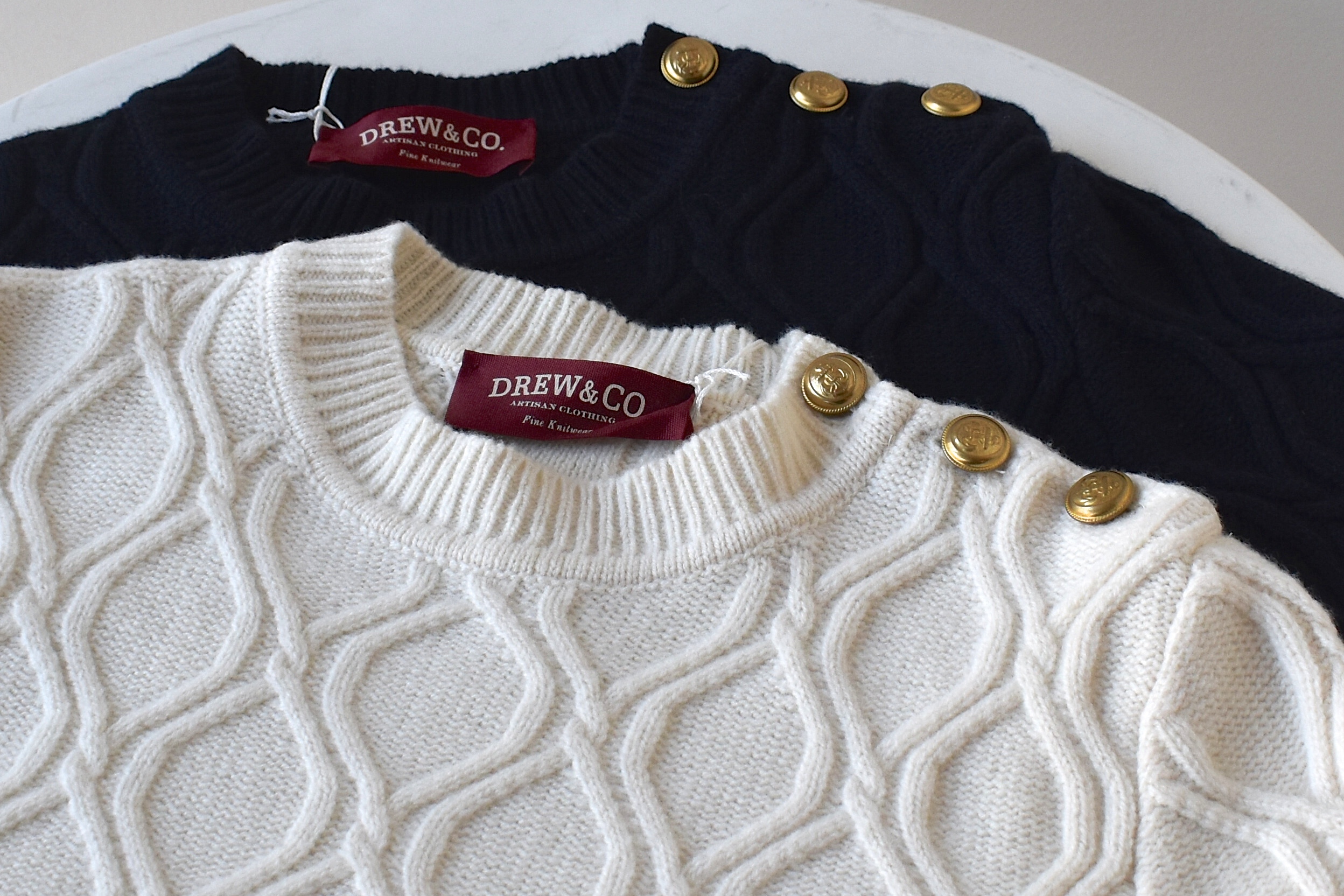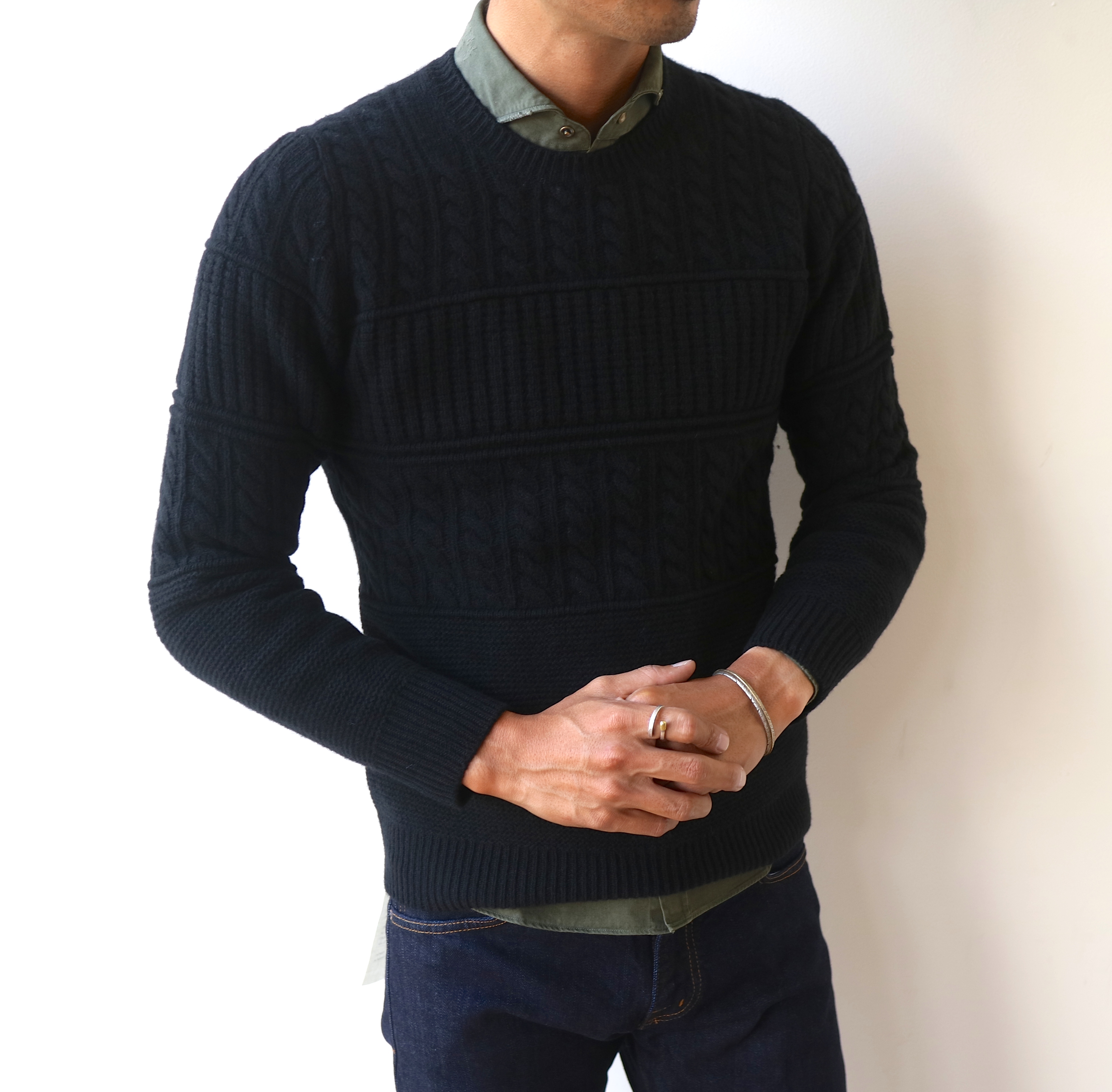 これまた個性のあるケーブル編みのクルーネック。肩口のメタル釦は、ゴールドに。1枚で様になるニットは、トレーナー感覚でシンプルに着ていただくだけでOKです。