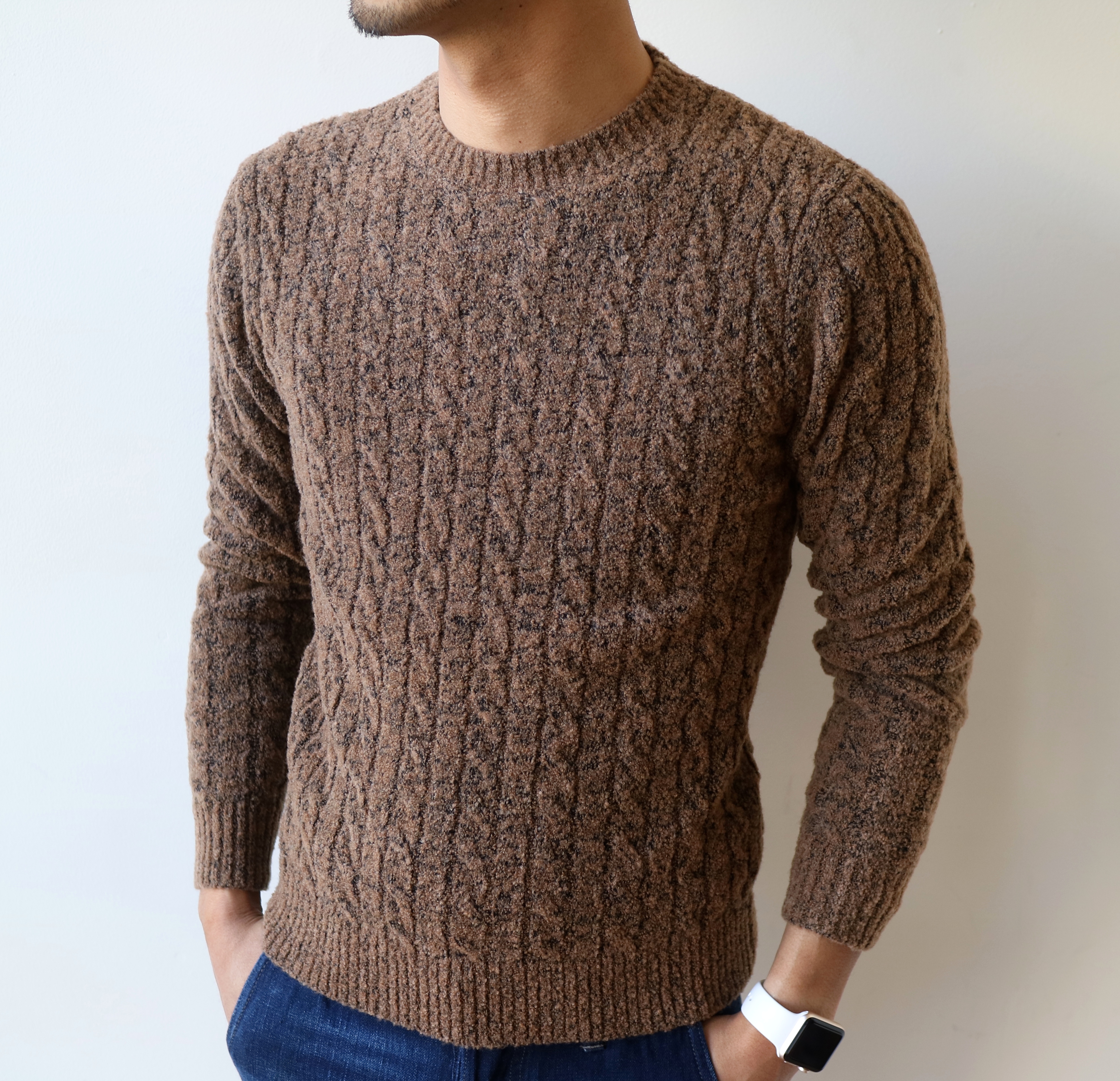 MODEL:ブークレ調ケーブル編みラウンドニット