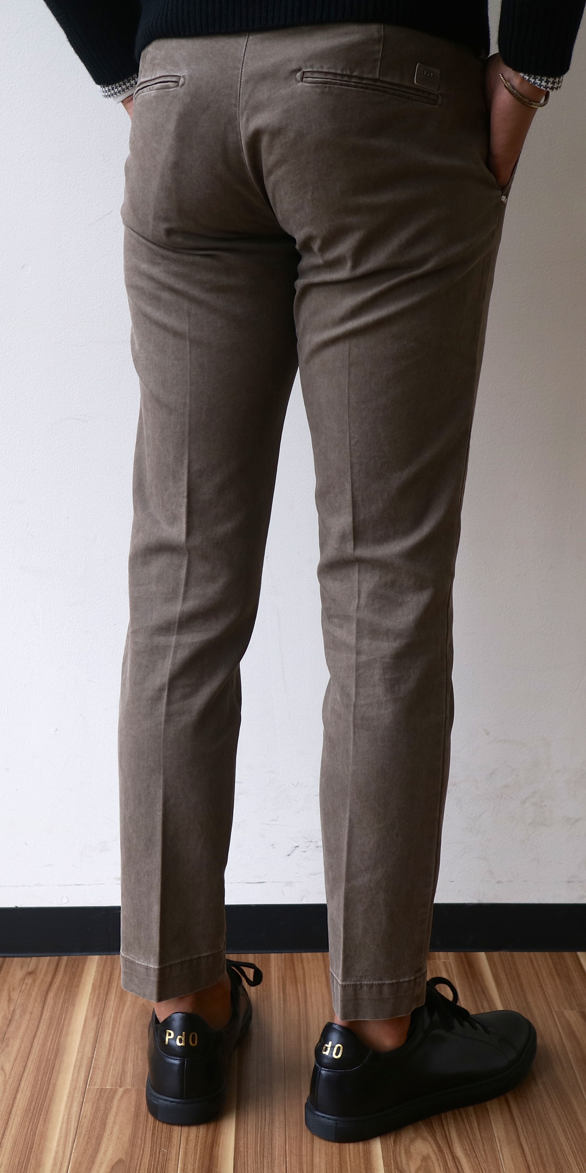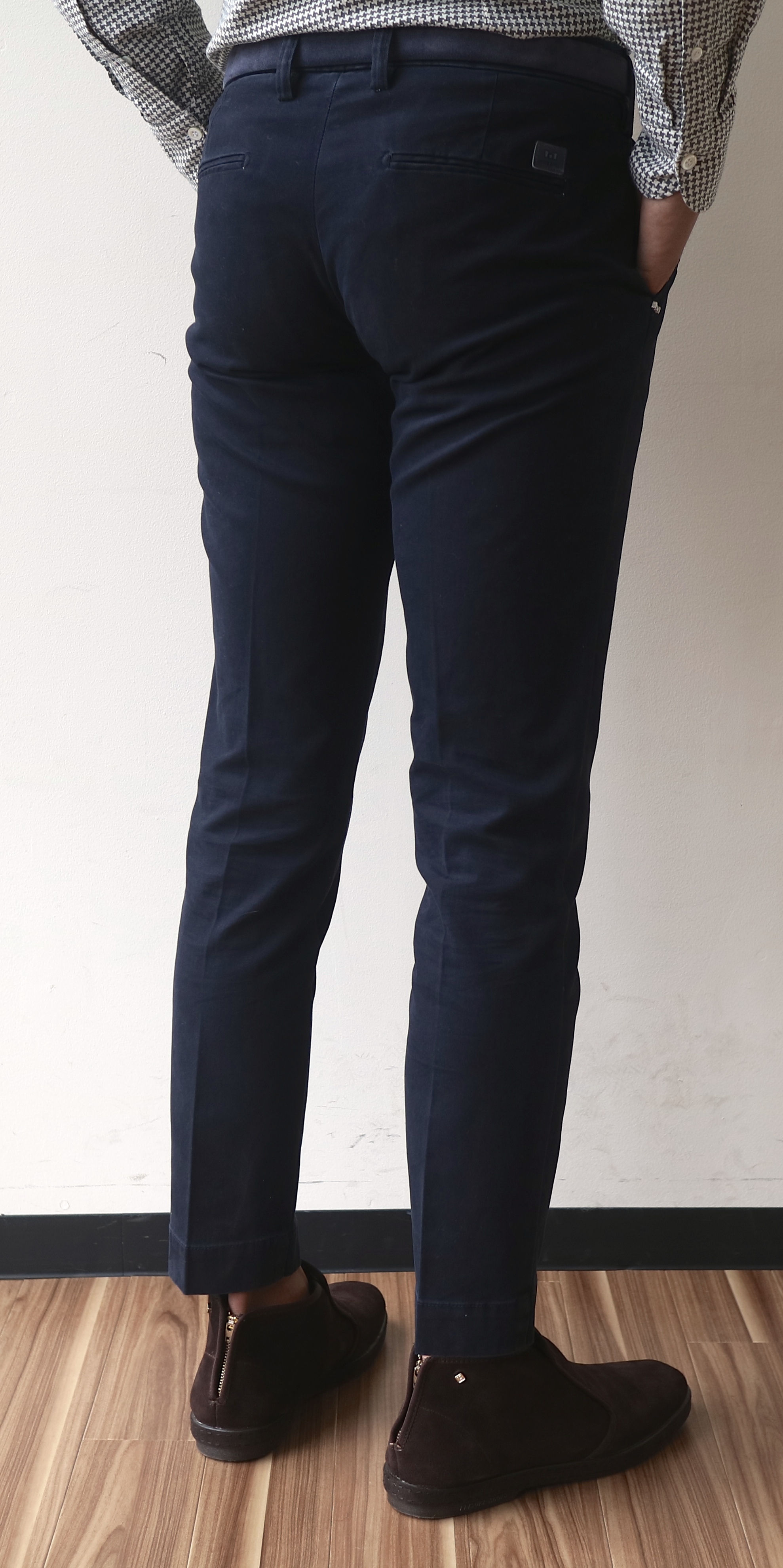 ノープリーツのスリムシルエットタイプ。定番色のライトブラウンとダークネイビー、まずはこちらからお見せしておきましょう。