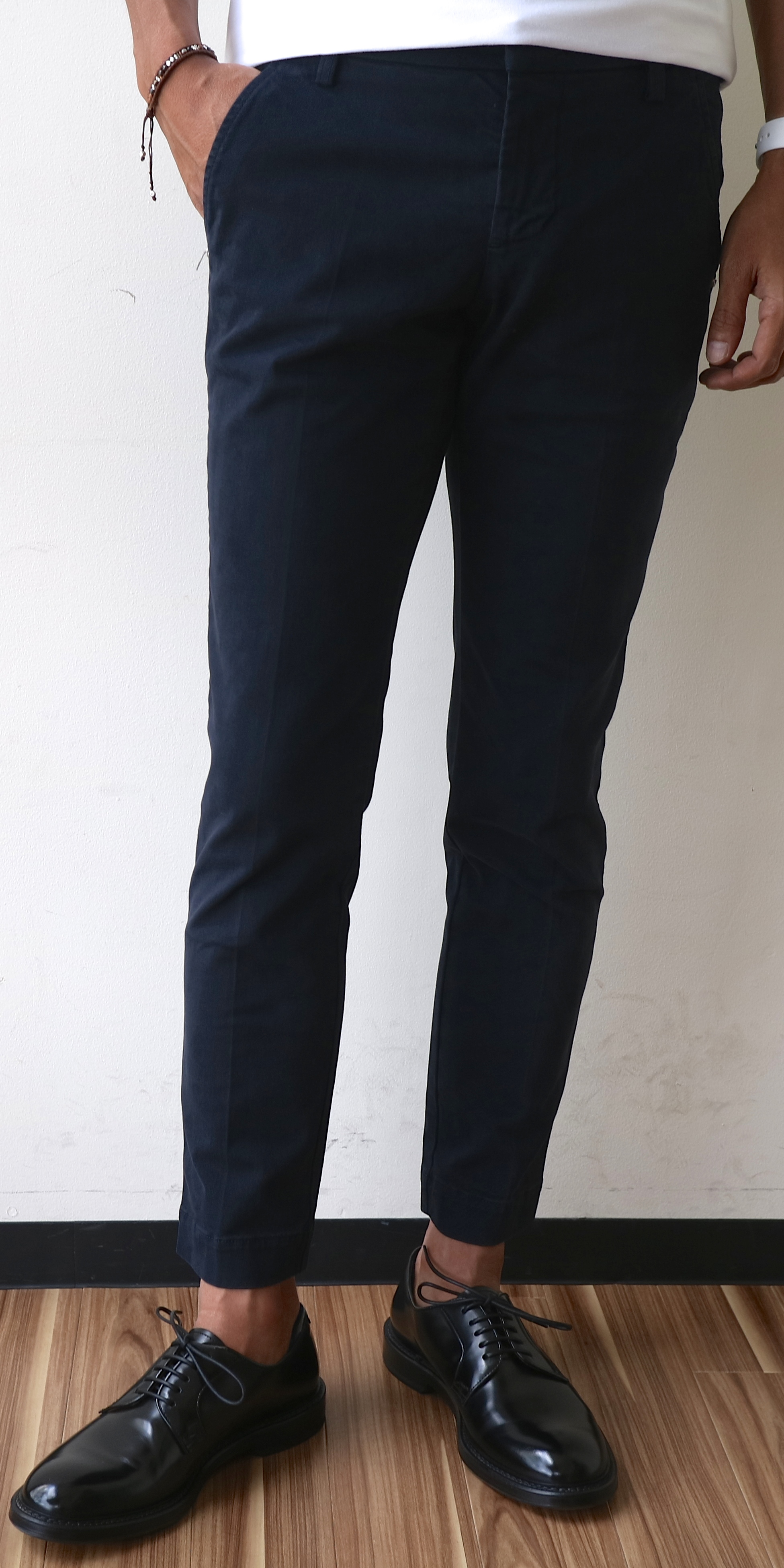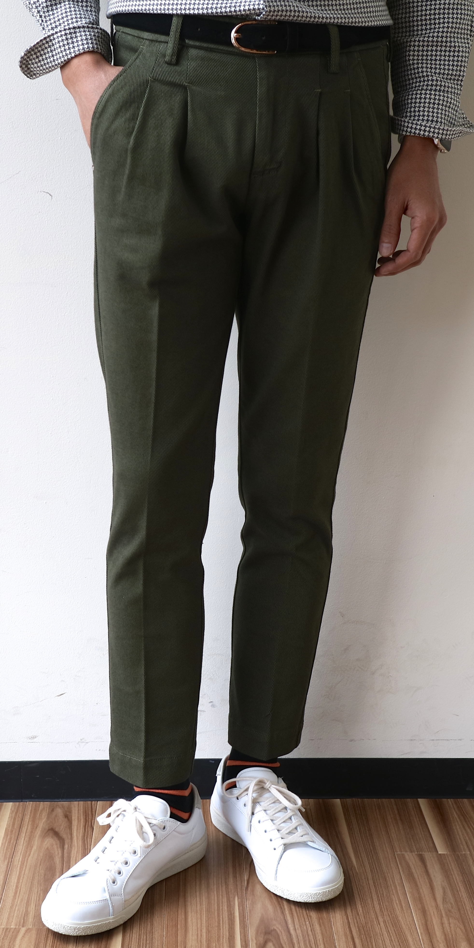 こちらは、ノープリーツ。オフベージュは着用出来ませんでしたが、ダークネイビーに、煉瓦色のテラコッタ、ダークブラウンを展開中です。