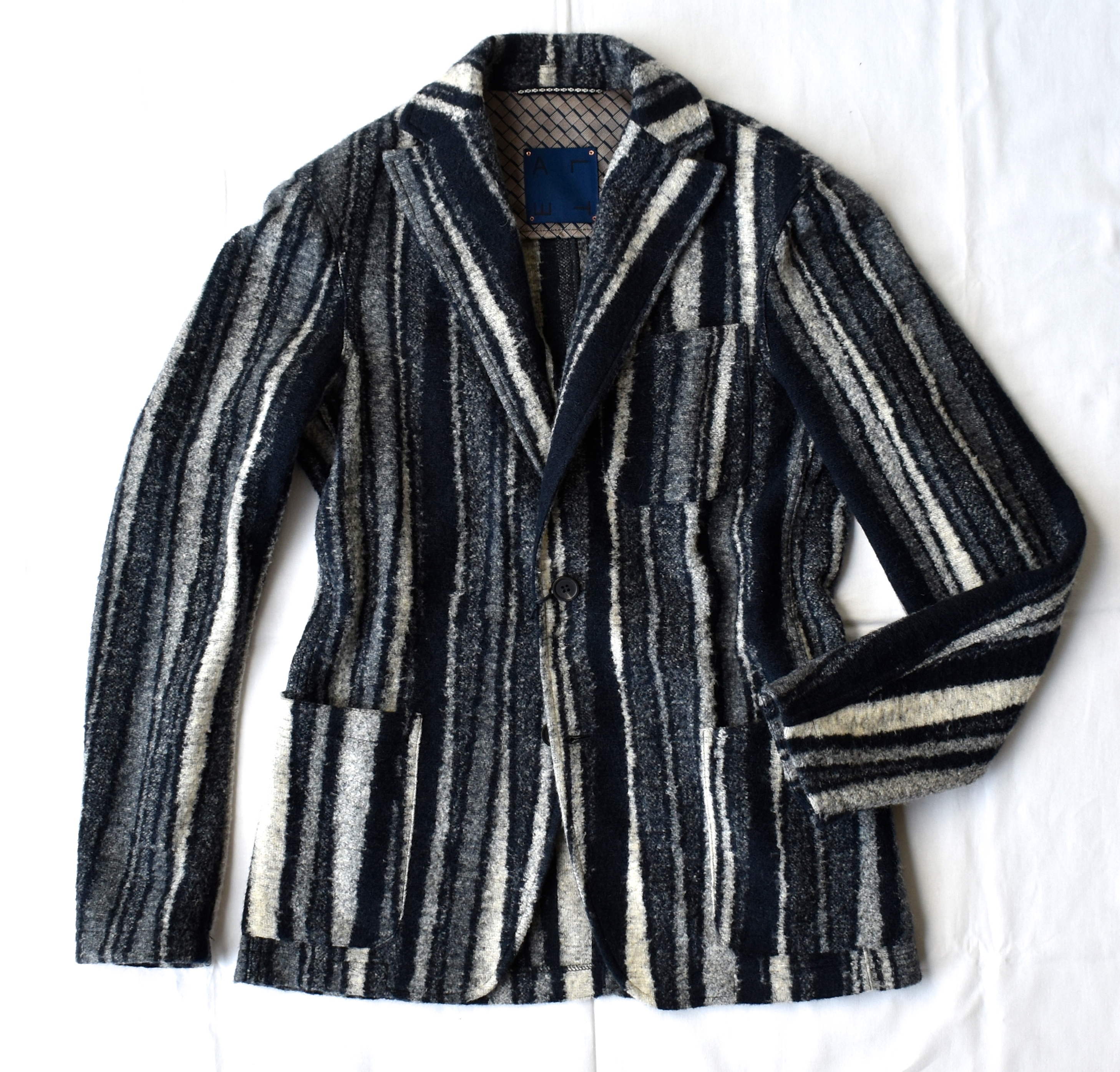 大好きなブルーは、変則ストライプ&グラデーションで。起毛感が加わることで、存在感も程々に。なかなか良い塩梅のジャケットです。