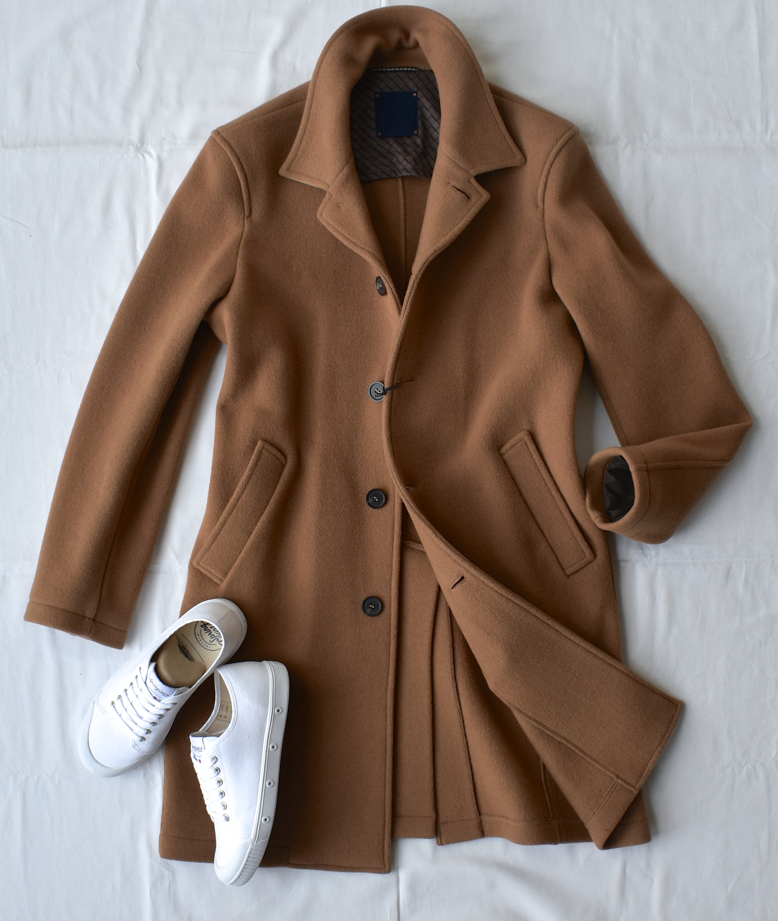 スニーカーに合わられるジャケット(コート)...というのもコンセプトの【COPPER/コッパー】。冬にこそトライしたい、キャメル。白スニーカーがよく映えそうです。思わずSpring CourtのG2を隣に置いてしまいました。