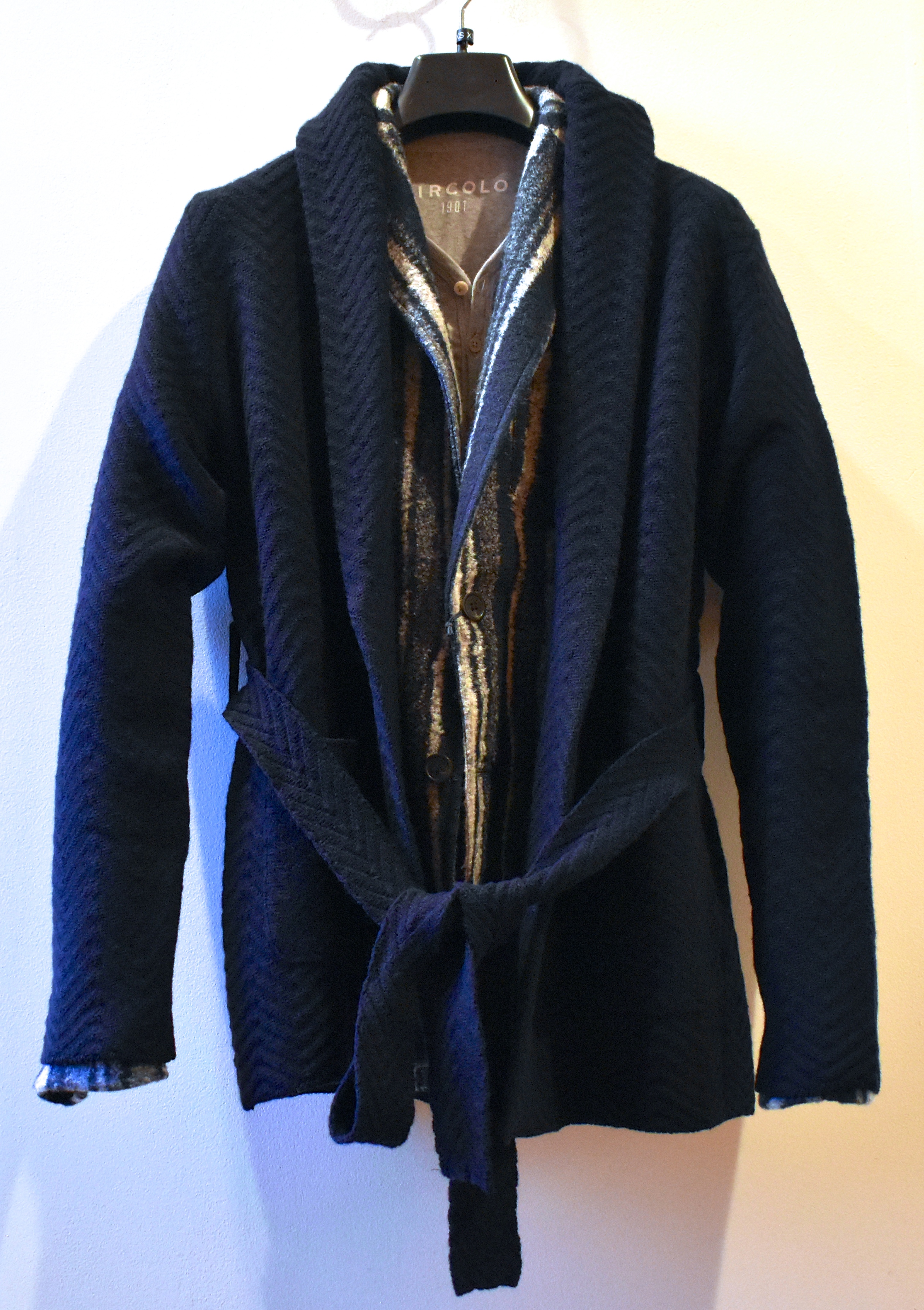 こんな羽織り方、重ね方は如何でしょう。COPPERのカジュアルジャケットの上に、重ねました。釦の付かないガウンですが、そこはウエストのベルトを締めるだけでOK。無造作っぽい感じで、きっとこなれて見えるはずですので。インナーはCIRCOLO 1901のヘンリーネックです。