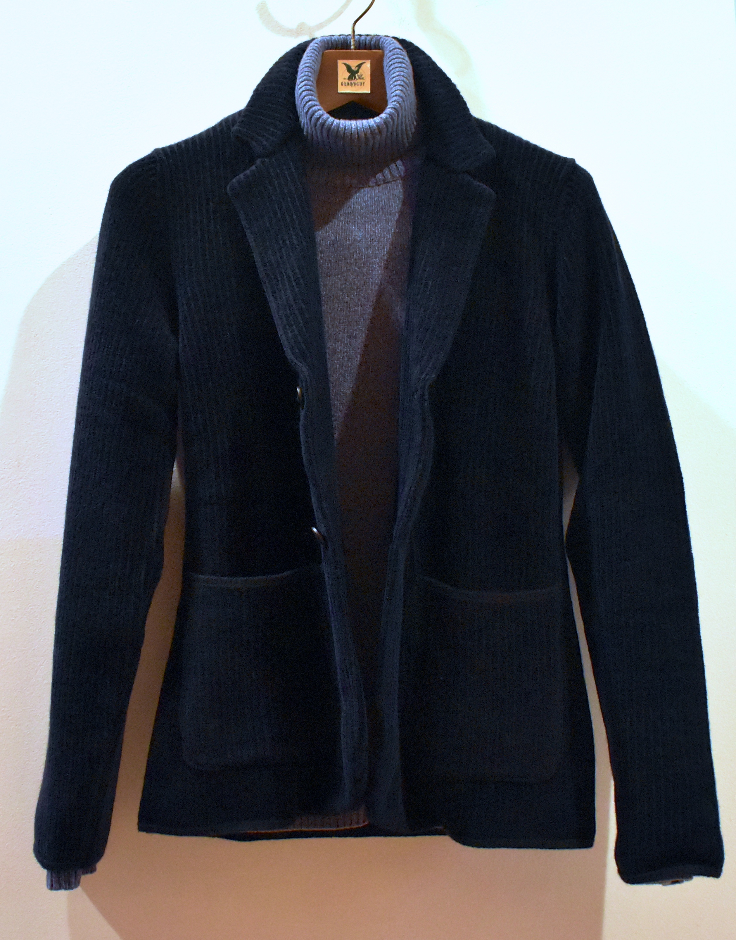 こちらのシングルも、なかなかの色気を秘めております。morganoのメランジタートルネックの上に重ねましたが、セクシーです。テイラードのジャケットにはない力の抜き加減がニットジャケットの魅力、それでいて洒脱感も兼ね備えた1枚でしょう。