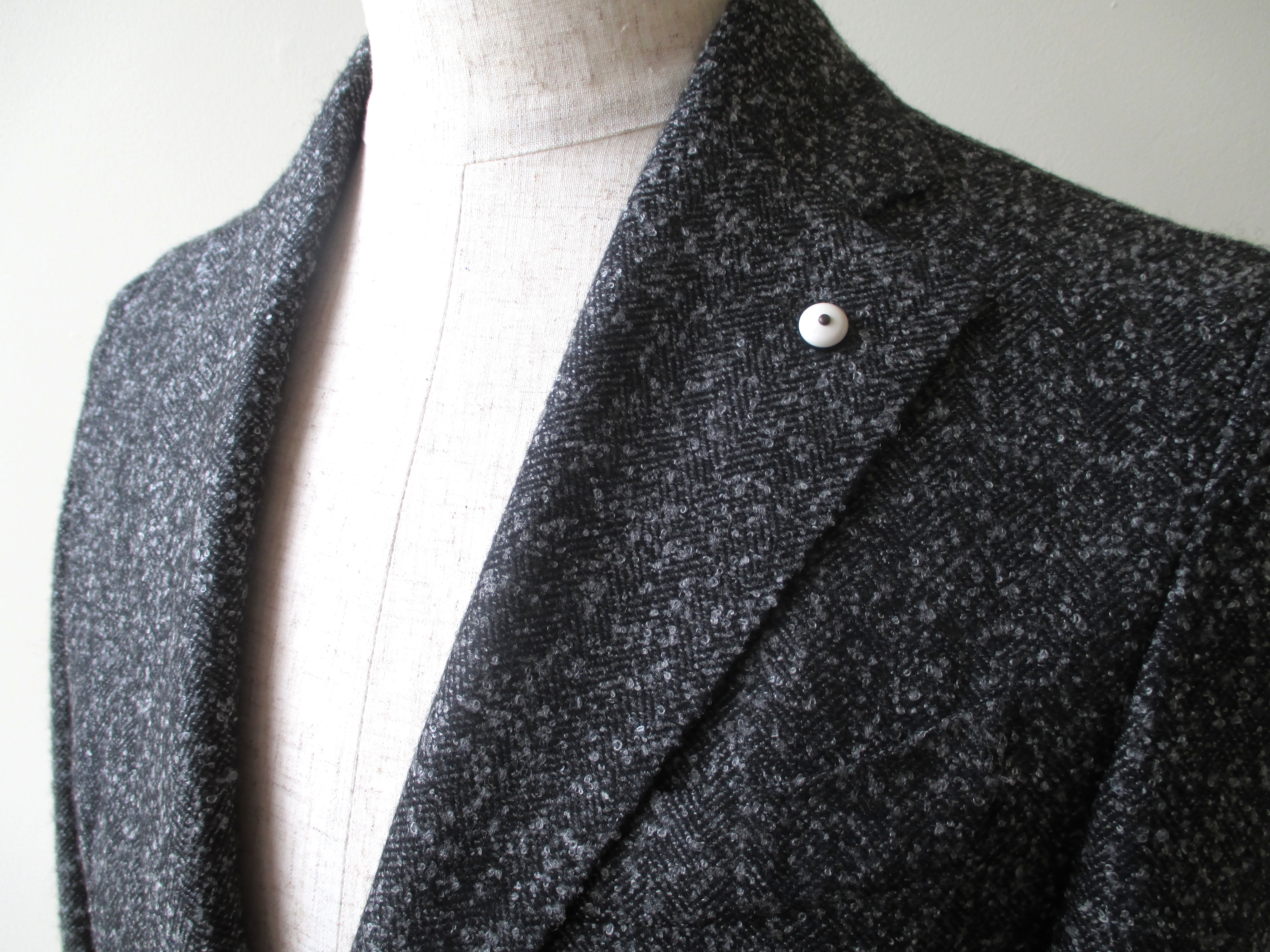 エルビーエムのジャケットでは恒例となりました、本切羽仕様の袖口。4つの釦が重ねて縫い付けられています。