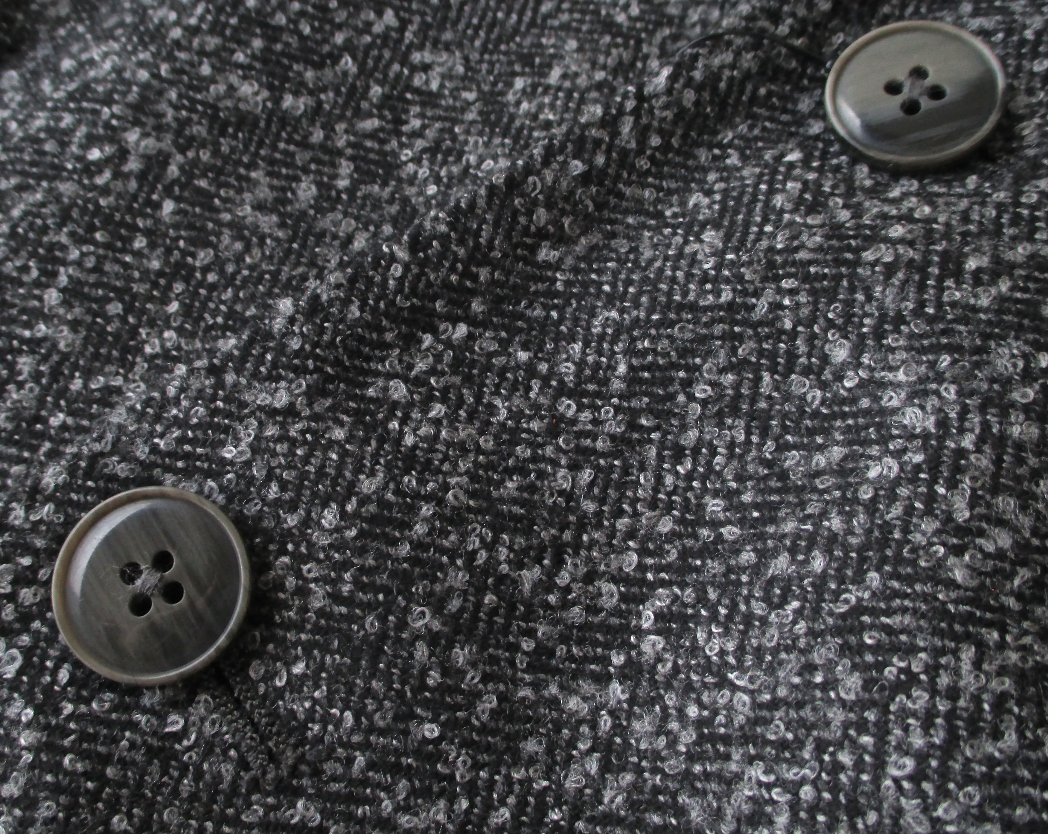 ヘリンボーン柄を不規則な形にしたブロークンヘリンボーン柄。ランダムに浮き出たライトグレイの糸によって、非常に表情豊かに感じます。ウールを中心とした4種混紡の生地は、暖かみのある顔つきでいて、他のジャケットとは一線を画す存在感があります。