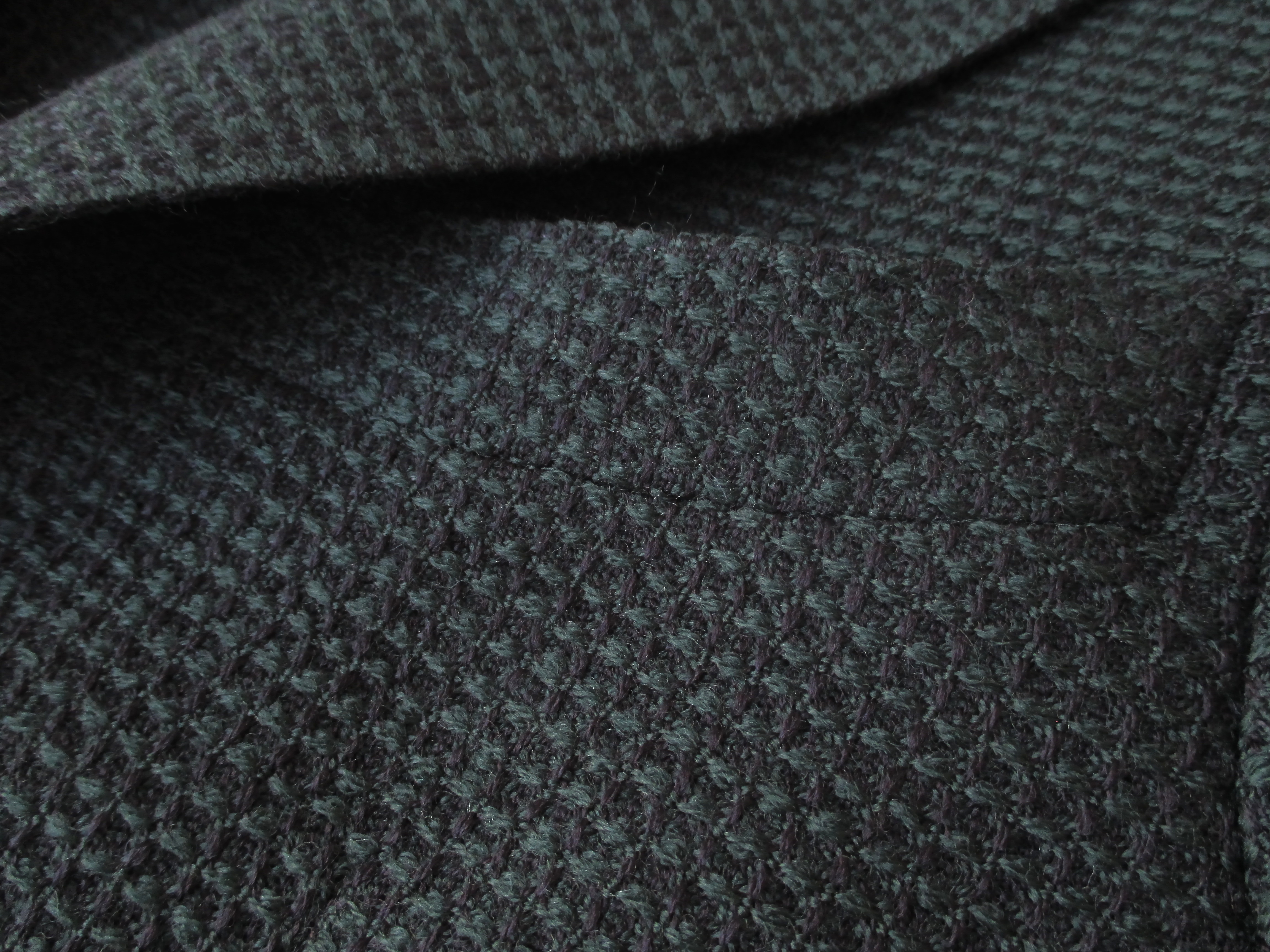 ダークグリーンと申しましたが、よく見ると、グリーンとネイビーの糸のコンビネーションになっていることに気付かされます。実は、このネイビーの糸の役割が鍵なのです。コントラストが抑えられることでシックな雰囲気になるとともに、相性の良いグリーンとネイビーが織り成すカラーリングは、ワッフル織りの凹凸感との相乗効果もあり、独特の発色に繋がっている・・という訳なのです。