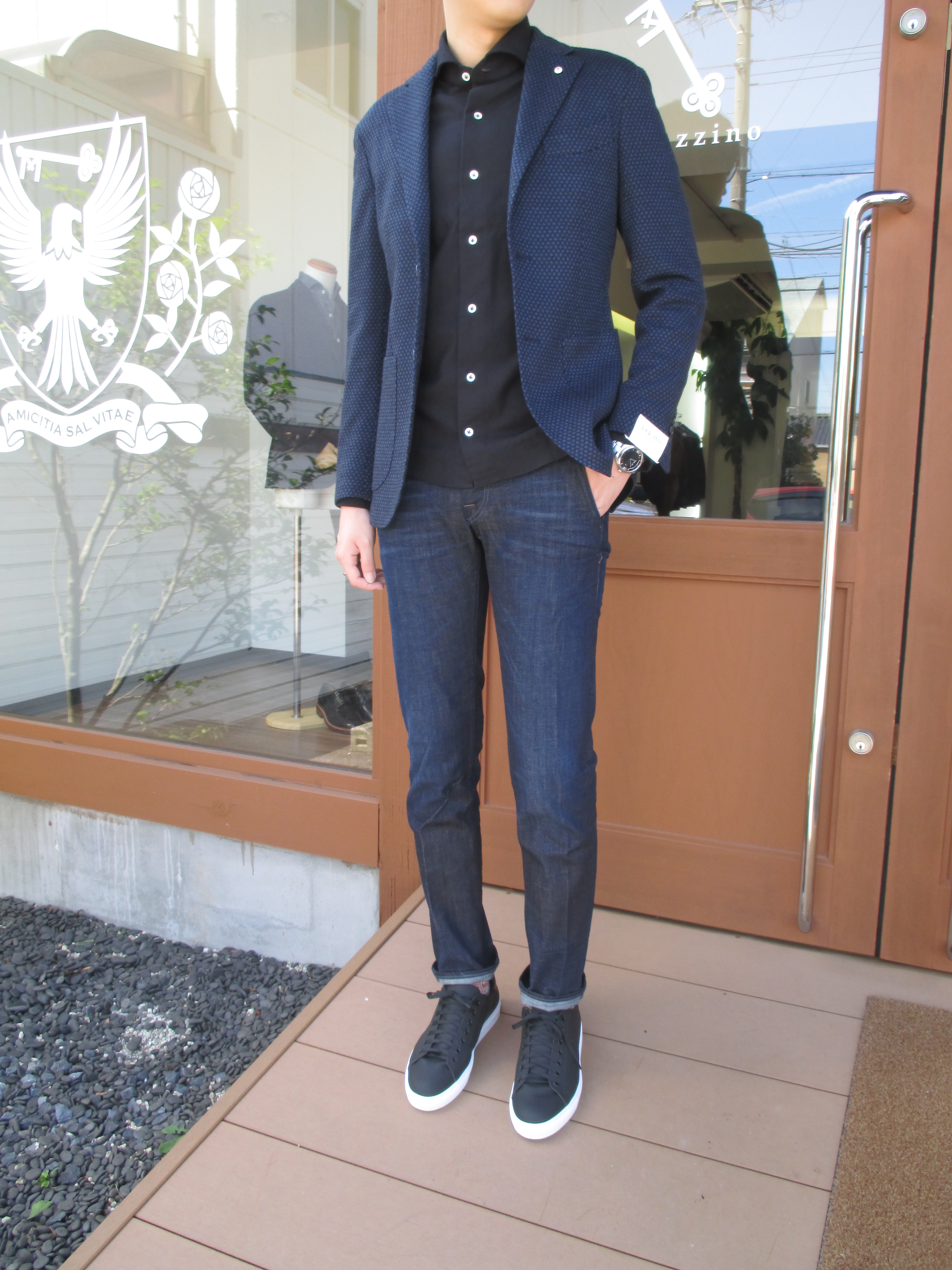 ブラックの大人の色気のあるGiannettoのシャツに合わせてみました。あまり堅苦しくならないようにデニムを使い、足下はちょいモードな雰囲気を感じるブラックスニーカーで合わせました。