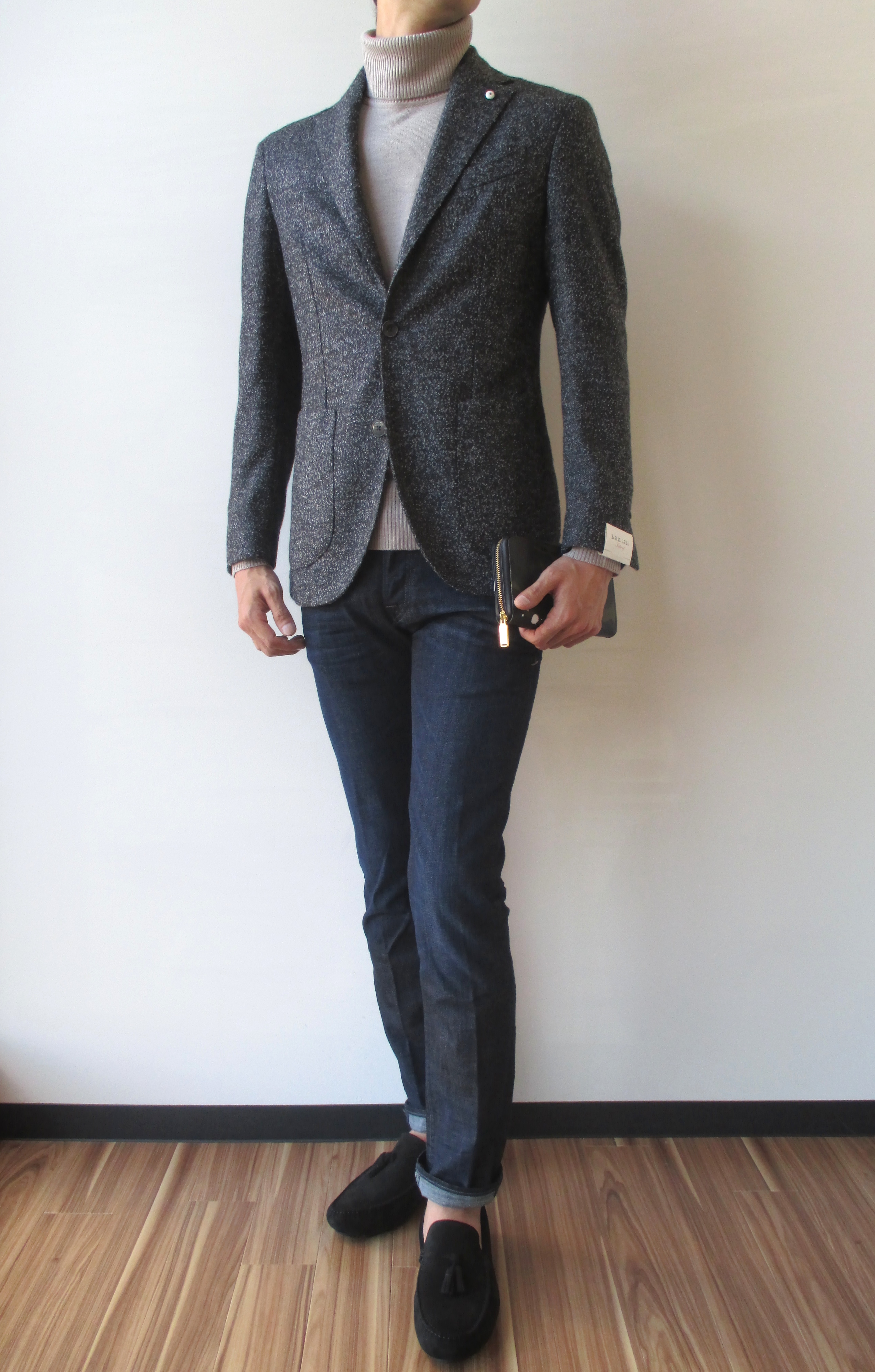 ジャケットのインには、こちらもシックにJOHN SMEDLEYのタートルネック(未公開)を合わせ、Care labelのデニムを履き、LARDINIのタッセルローファーを選びました。手にはGENTIL BANDITのロングウォレット(ブラック)を持っています。