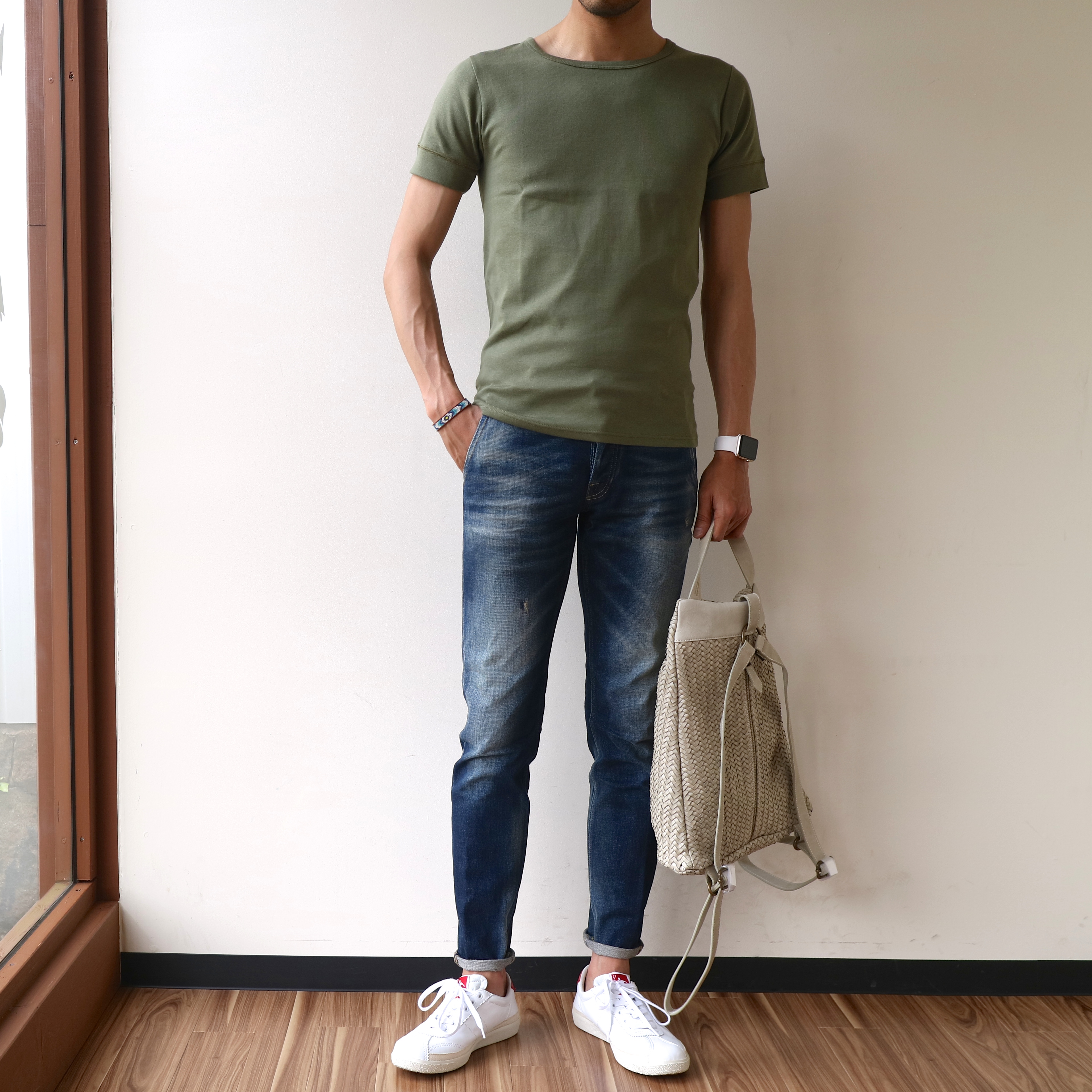 カットソースタイルでは、上質なアイテムを組み合わせ、周りとの差を狙いましょう。デニムはCare label、スニーカーはPantofola d'Oro、バッグはTIBERIO FERRETTIのZAINETTO、ブレスレットはCHAN LUUです。