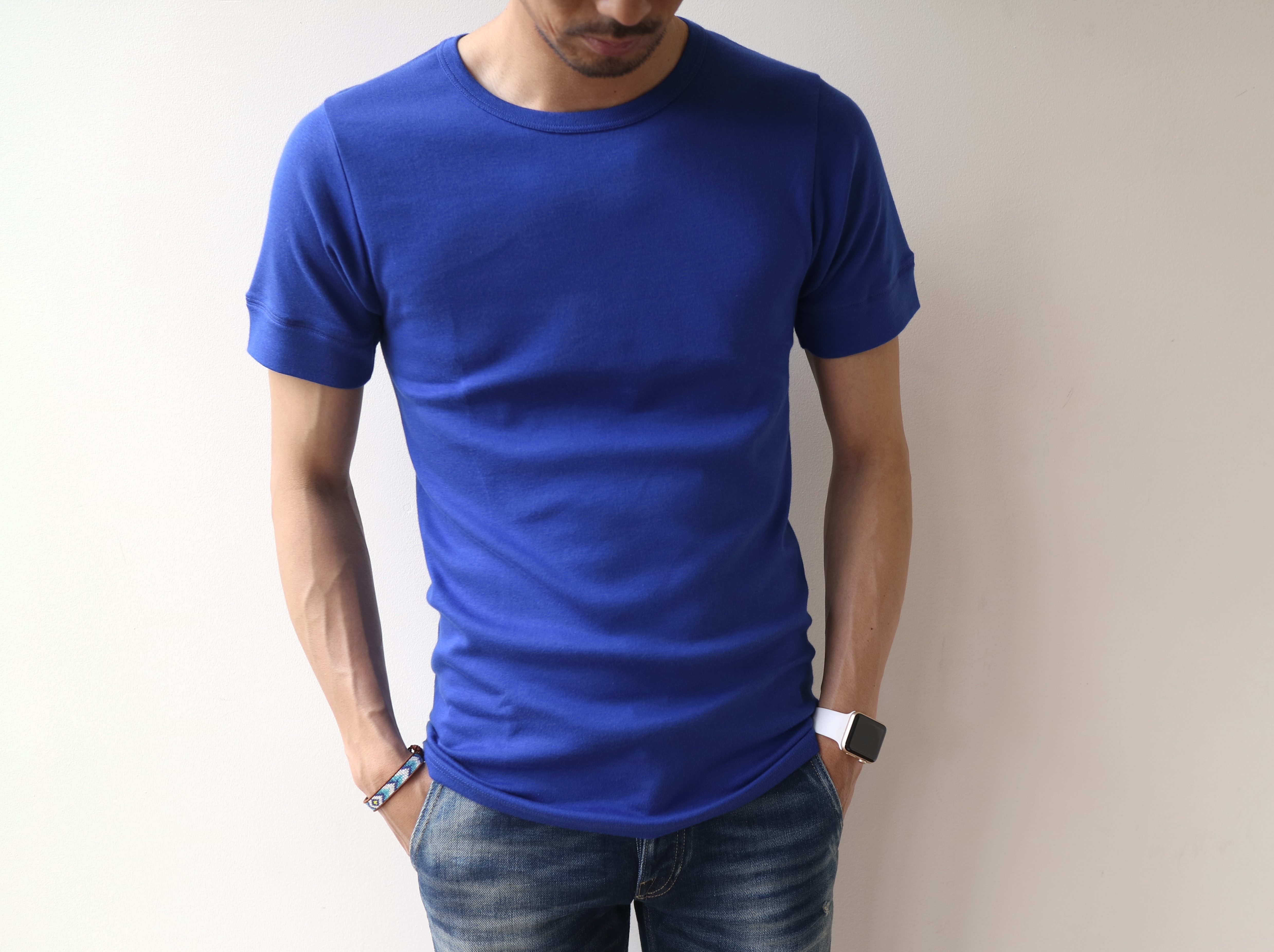 鮮やかなブルーの4色をご用意しました。生産の都合で、ブルーはLサイズのみの入荷となってしまいました。が、着るとそれはそれで良い塩梅。今までジャストサイズばかり着ていたので、新鮮です。色違いならぬ、サイズ違い(ちょっと大きめに着る)での購入も面白いかも...すみません、脱線しました。