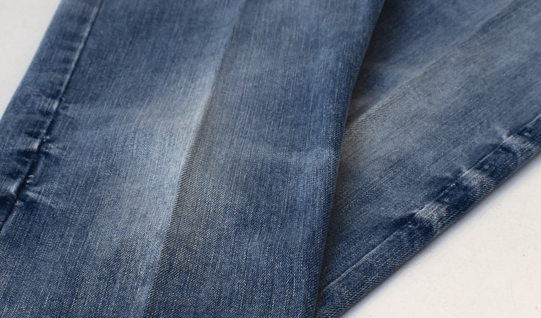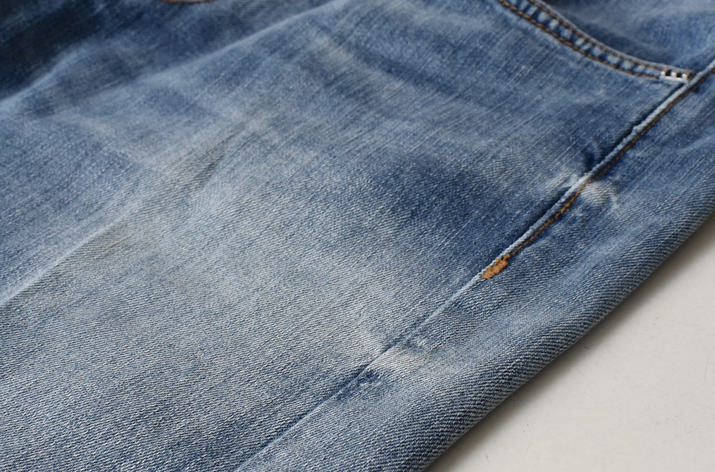 綺麗なデニムブルーです。特にウエスト部分は表情豊か。写真では見えませんが、フロントはジップフライとなっています。