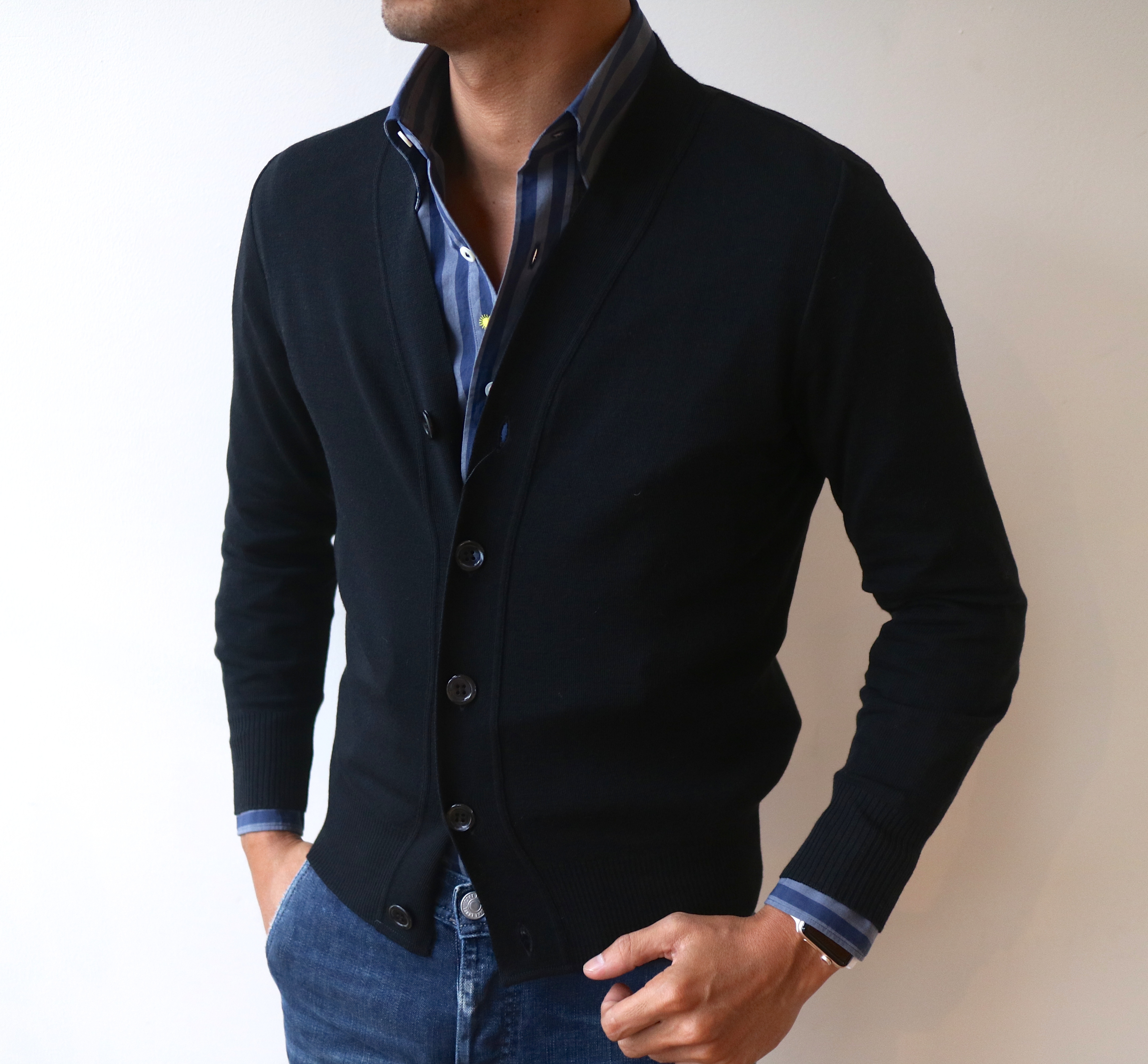 ハイゲージのカーディガン「HENRI/アンリ」。ブランドを代表する大定番は、チャコール、ネイビー、ブラックの、これまた基本のカラーをご用意しております。スーツのインナーから休日の羽織りまで、幅広く活躍することでしょう。