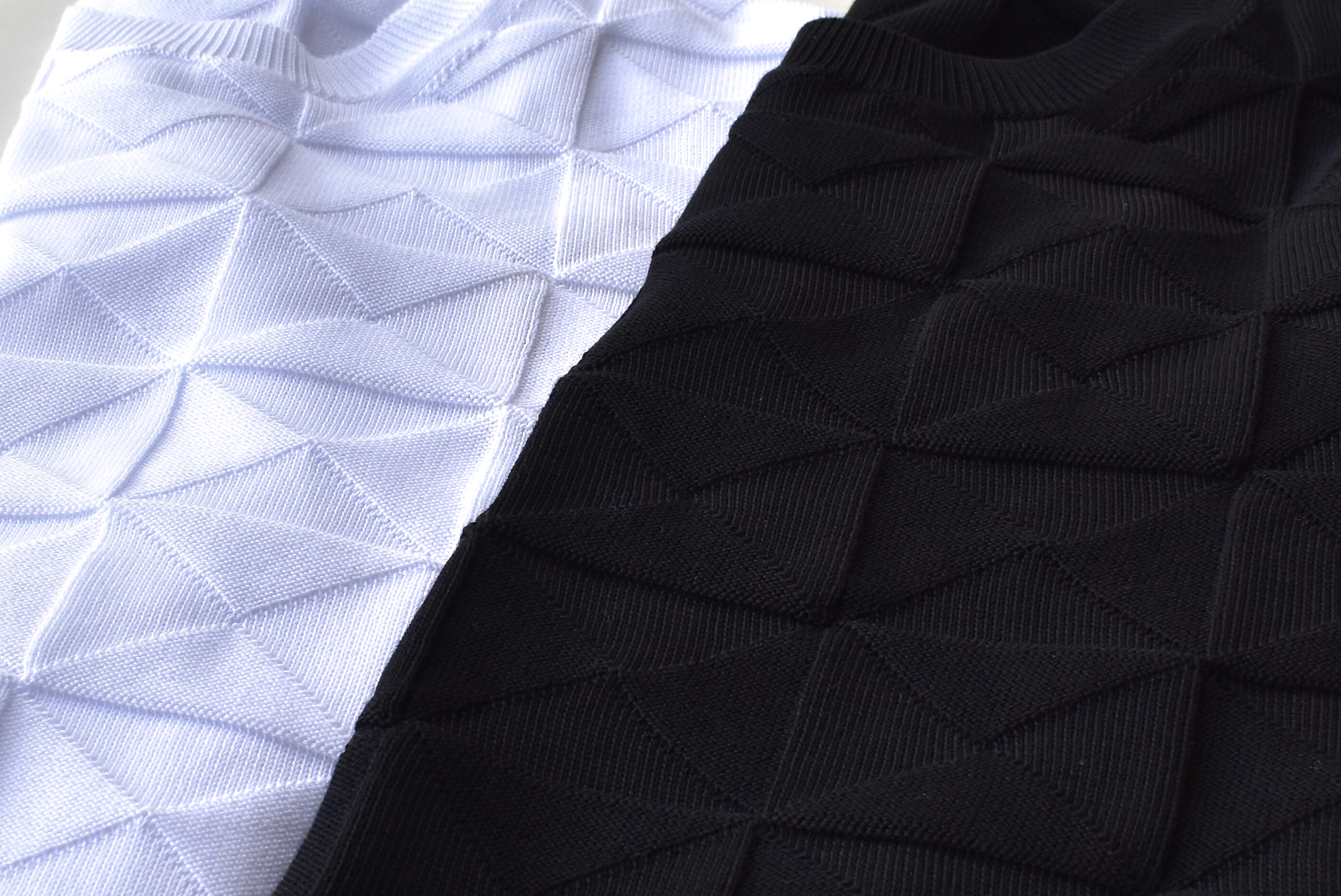 如何でしょう。編みによる凹凸感が、ベーシックなアイテムのなかに絶妙な立体感をもたらしてくれます。先にブラックから言及しますが、夏に敢えてのブラック。立体感のあるブラックは、重たくなくてクールな印象。今年の夏はクールにいきましょう。一押しのカラーです。カットソーでは定番のホワイトは、ニットでこそトライしたい色でもあります。グッと洗練された印象に繋がるのではないでしょうか。