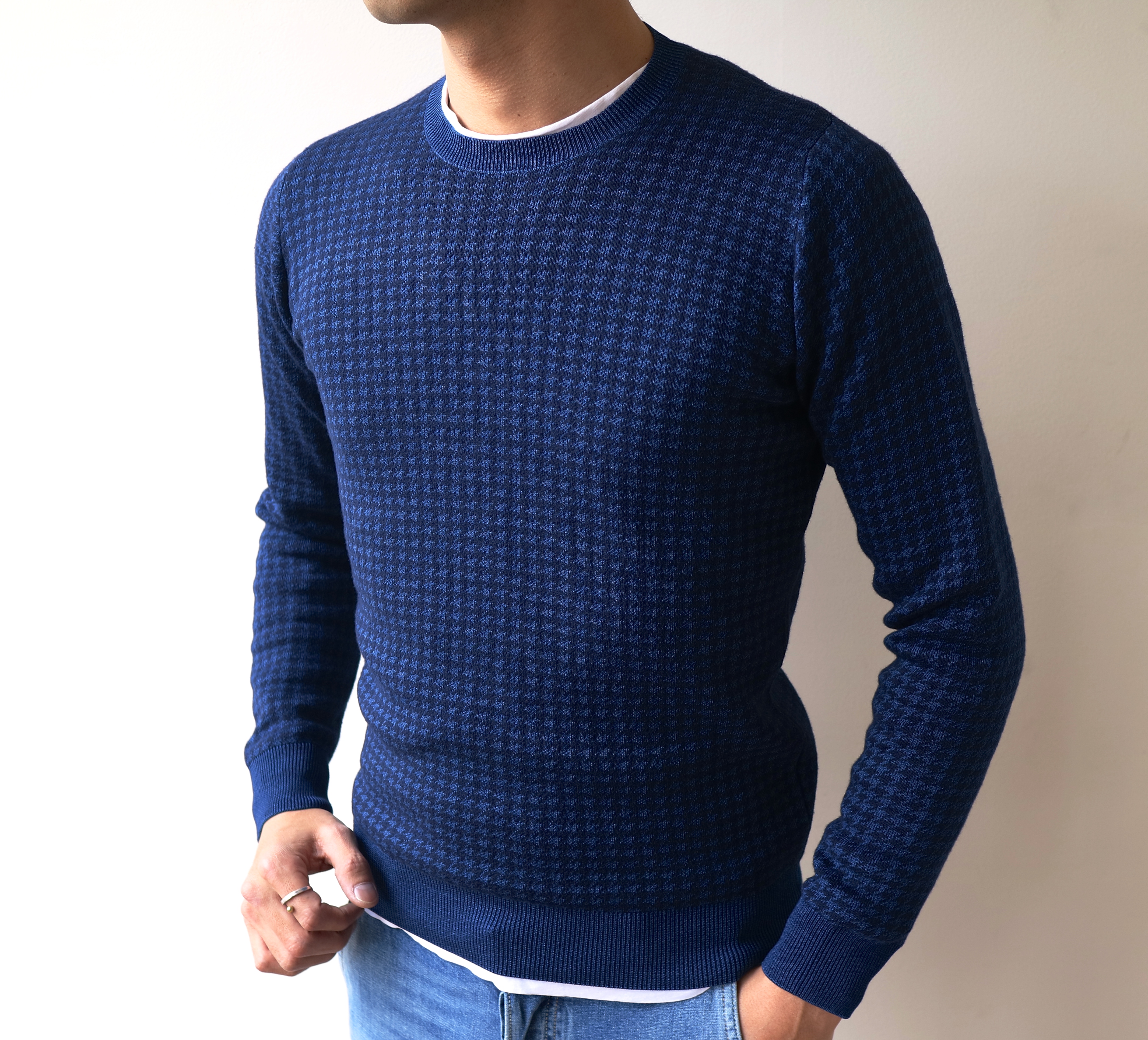 MODEL:「6P661G」インディゴハウンドトゥース柄 コットンクルーネックニット