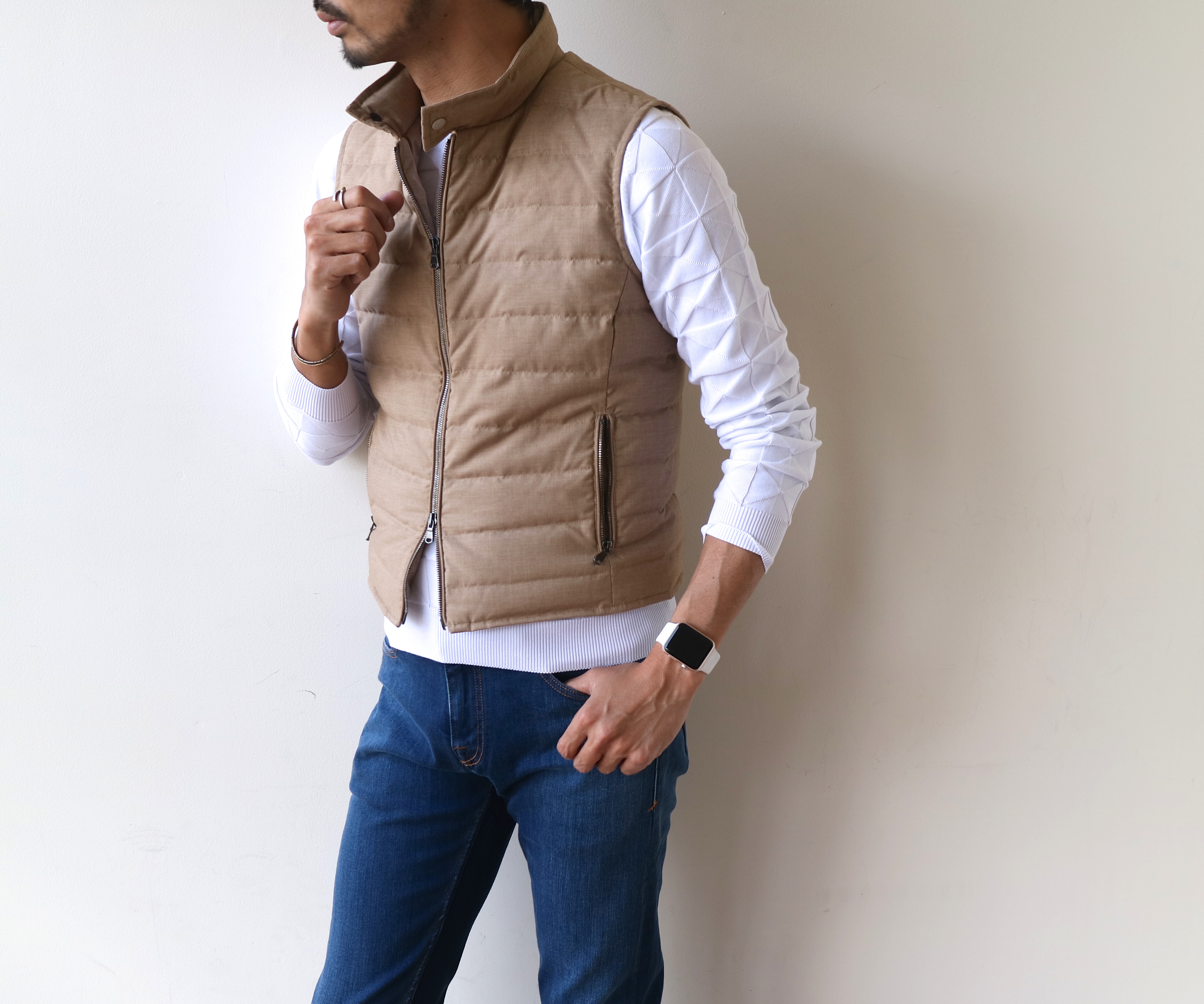 合わせたベストはEMMETI、パンツは、BRIGLIA、靴はCROKETT&JONES、手に持った鞄はBoldriniSELLERIA、首元には、ALTEAのネッカチーフを巻いています。バングルD'AMICO(未公開)