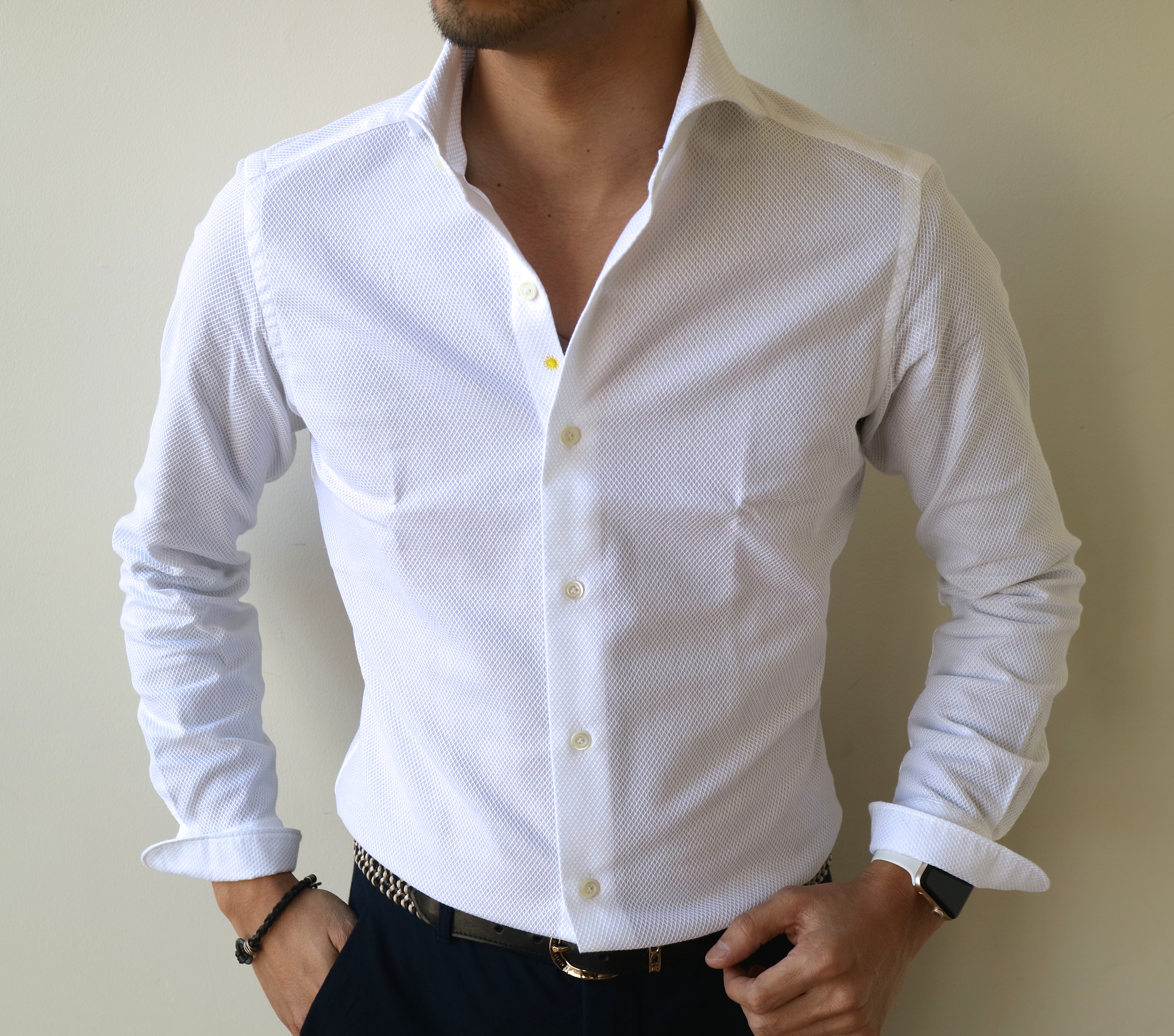 MODEL:「SLIM FIT」コットンメッシュ織りソリッドシャツ