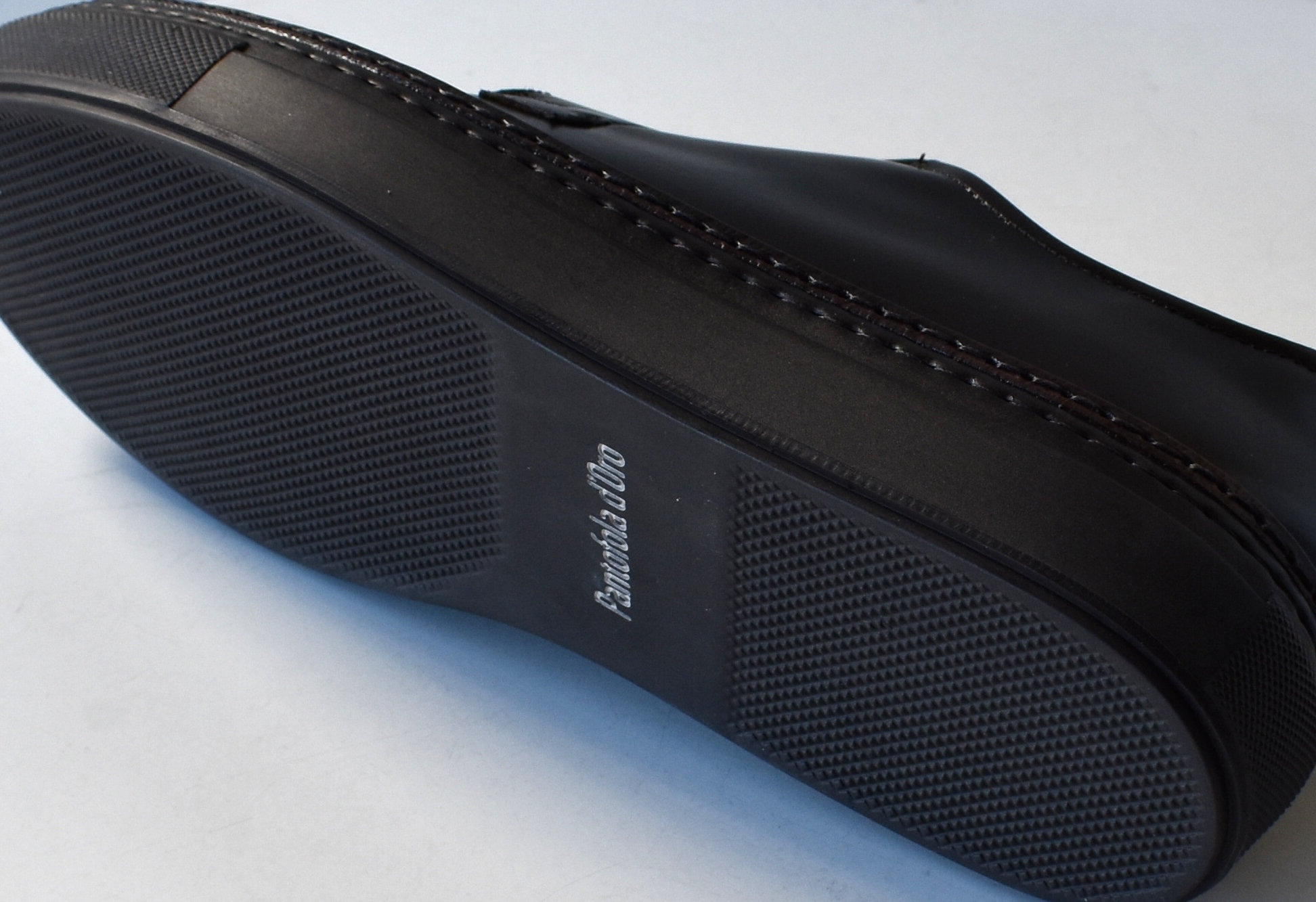 実は、1番始めに買ったパントフォラ ドーロがコチラ。もう1年以上履いており、深くシワが刻まれています。コチラも同じくオールレザーのタイプですが、もう少しツルッとして・クリアな質感のレザーです。黒という色目もあって、独特の光沢感もあります。1回もオイルなど塗っておりませんが、ブラッシングするだけで、この光沢感が出てきます。