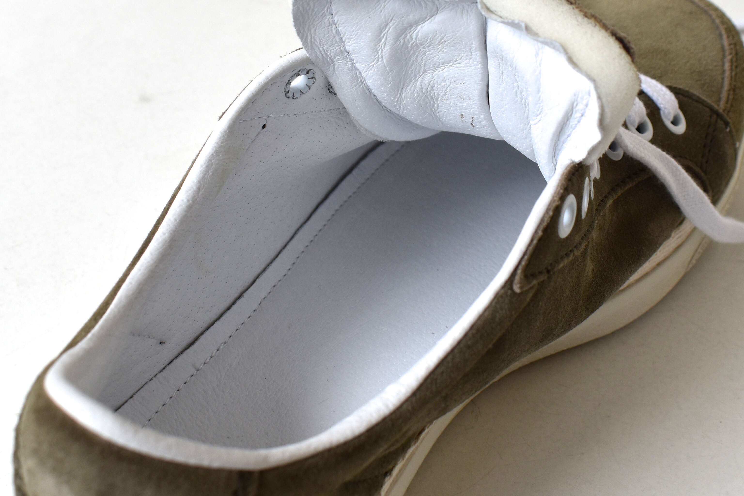 パントのレザースニーカーは、素材の柔らかさに特筆すべきものがあります。定番のカーフレザーのものと同じように、こちらのスエードも、非常にソフトなもの。カーキの色合いも、良い感じ。上質な素材感を求めるならば、やはりパントです。