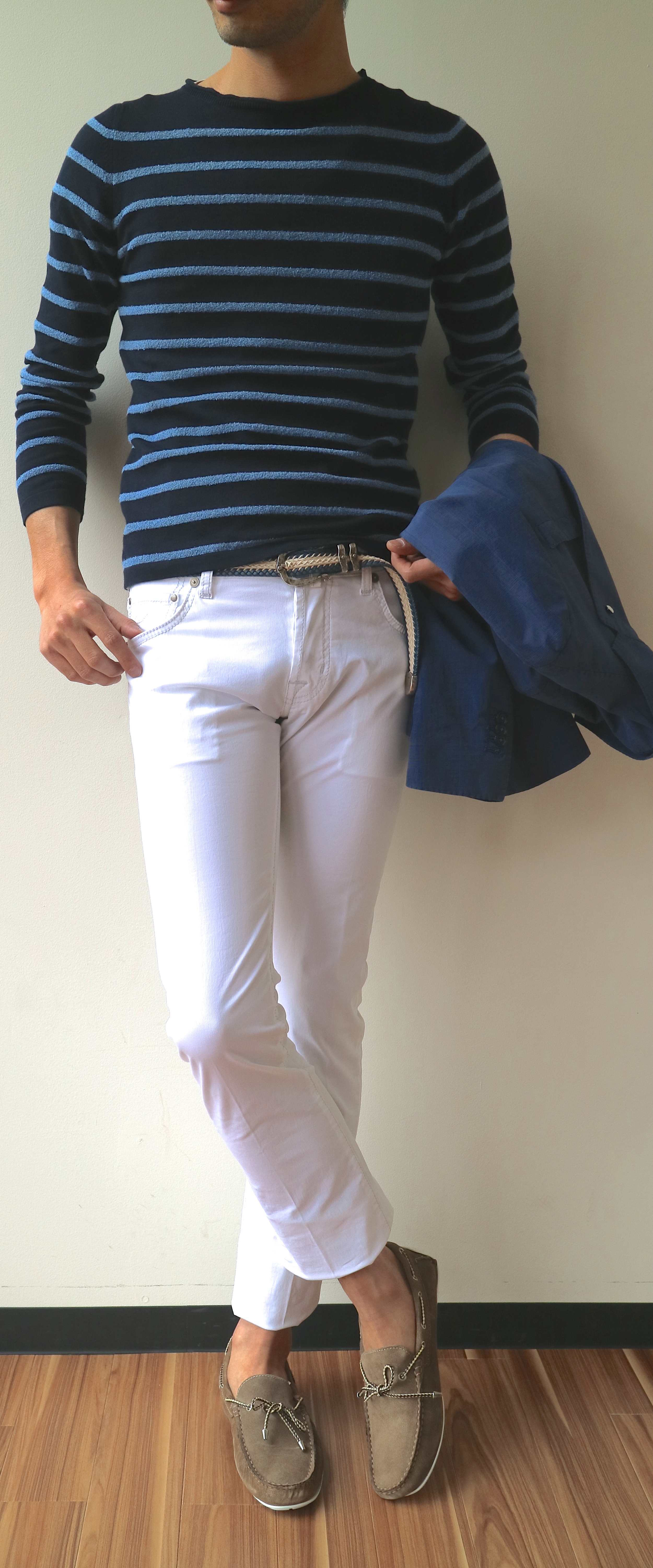 左のコーディネートは、トップスにPANICALE、L.B.M. 1911のジャケットを手に持ち、パンツはJACOB COHEN。ベルトにTIBERIO FERRETTIを合わせています。右は、invictaのブルゾンに、パンツはentre amis、手にはGENTIL BANDITのバッグを持っています。