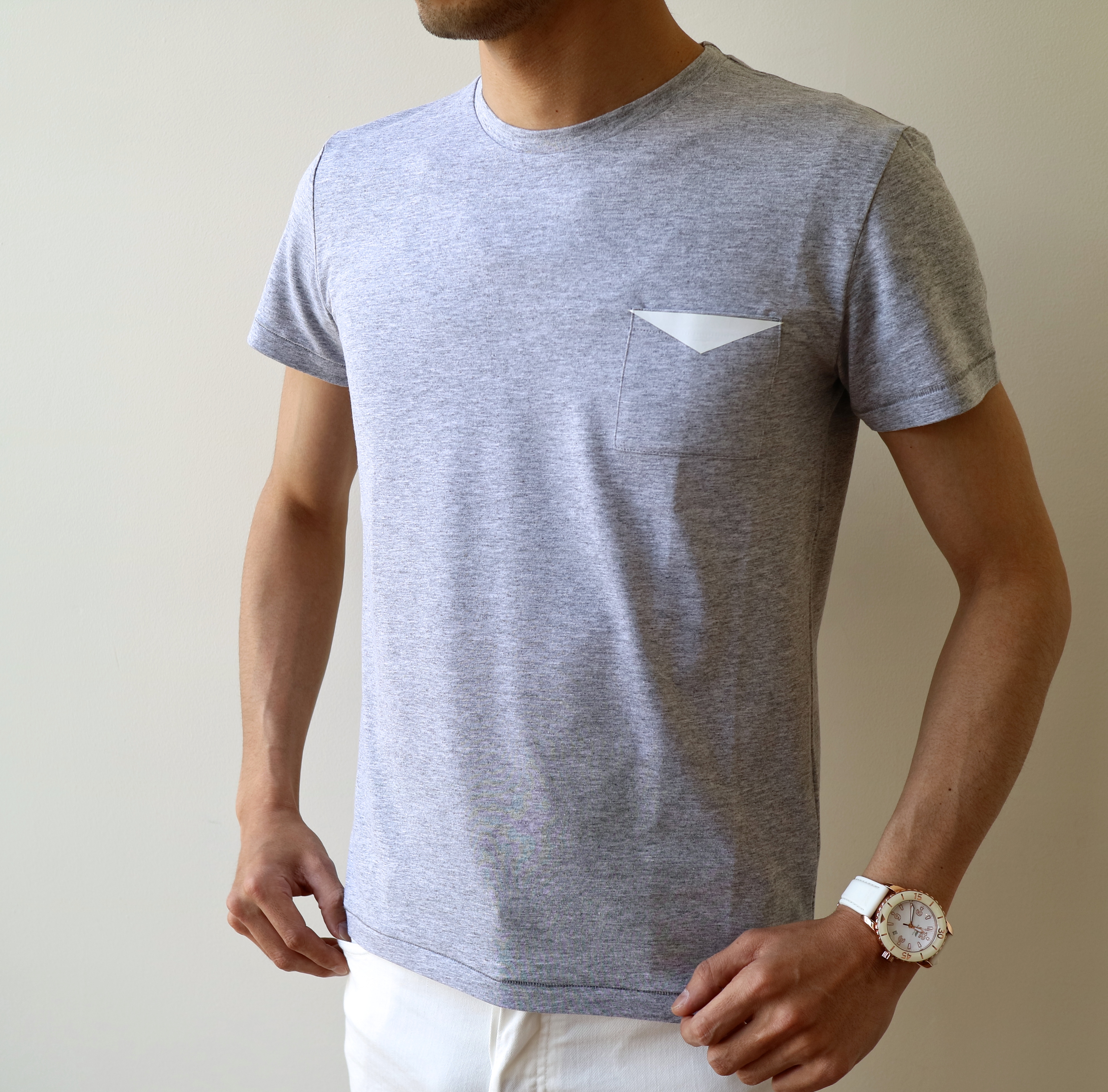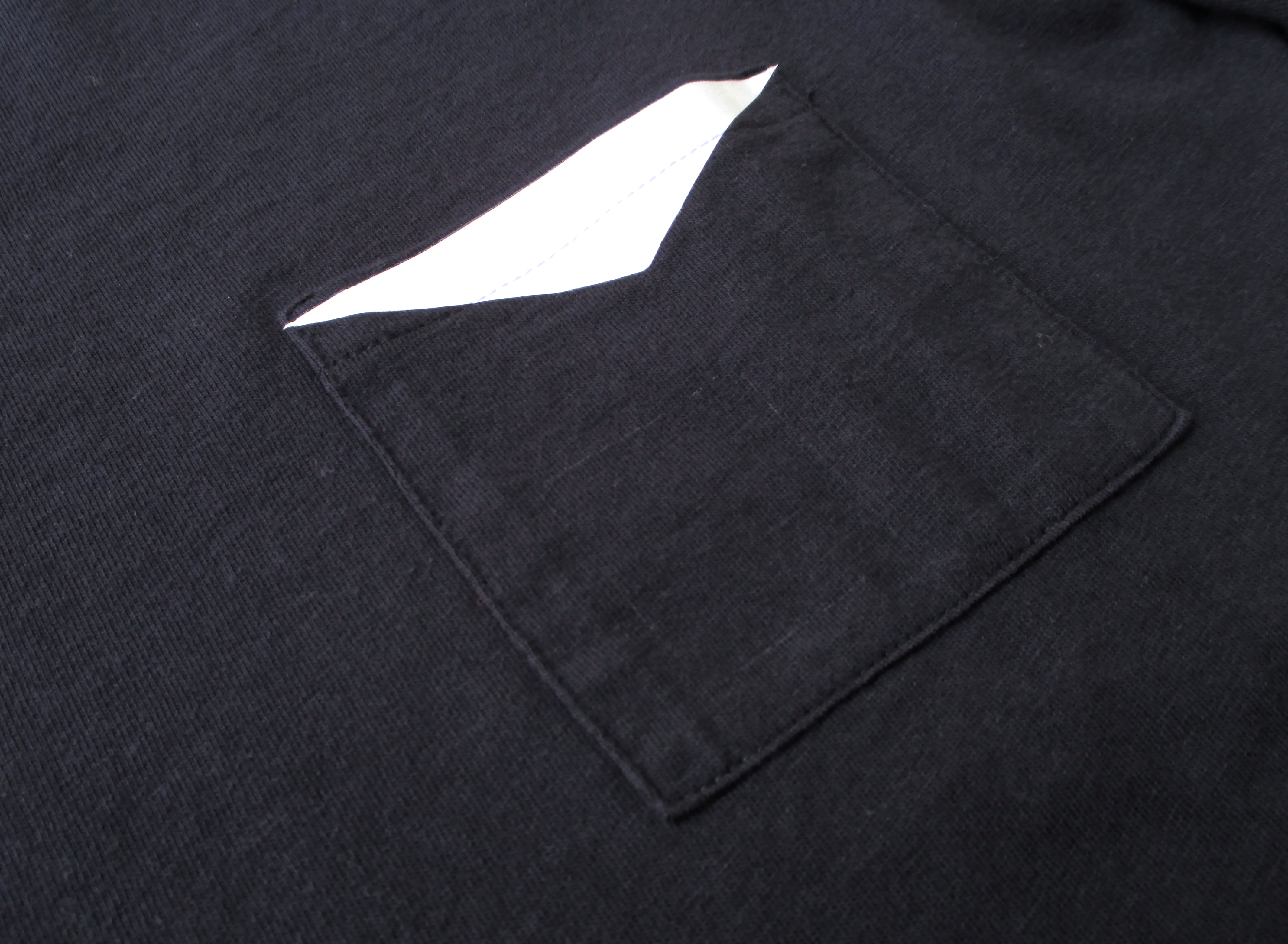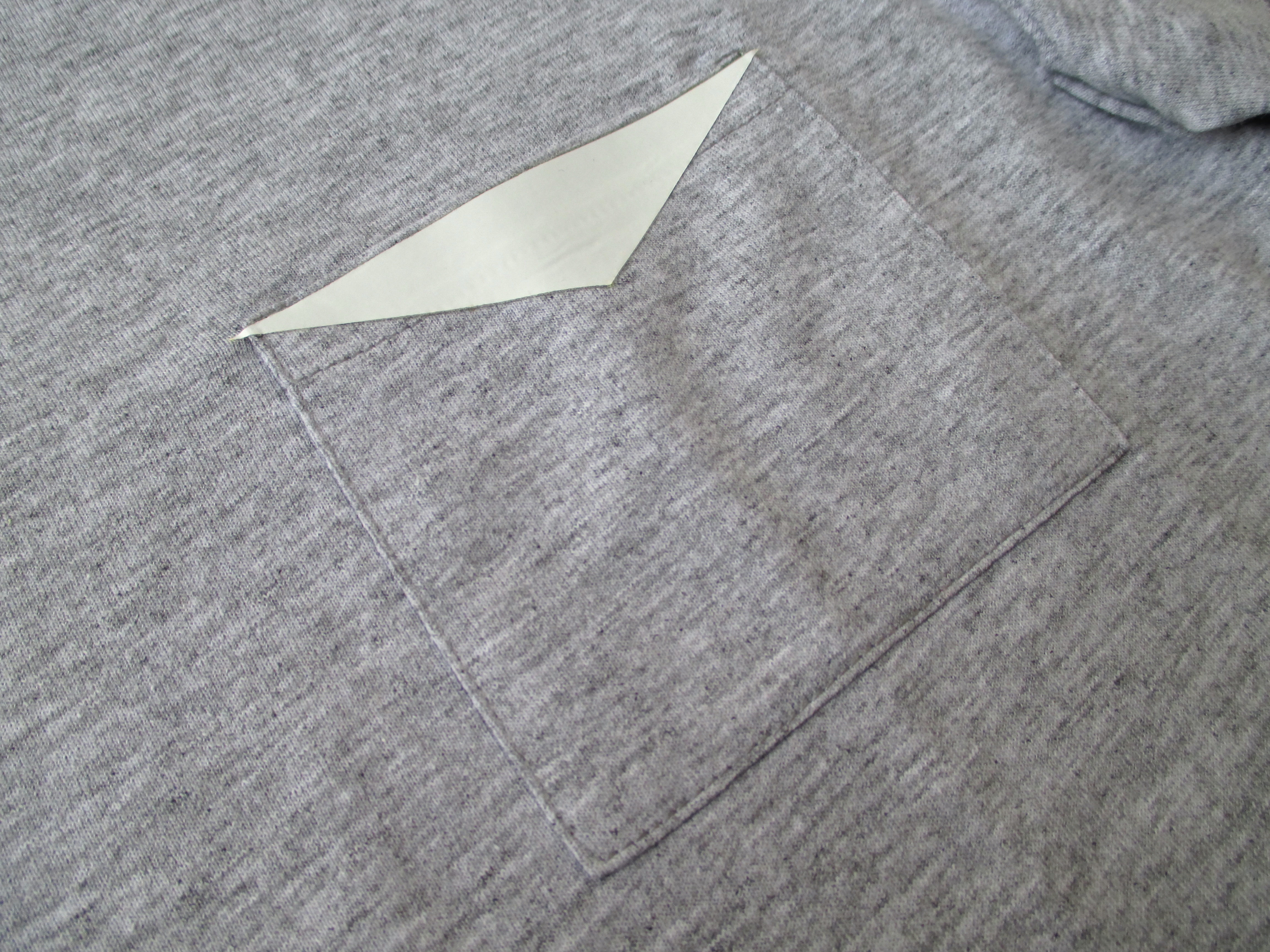 胸ポケット付きの、シンプルなクルーネック。ポケット部分にトライアングルのプリントが入ることで、一気にアーティスティックな雰囲気に...主観的な表現ですが、そう思います。