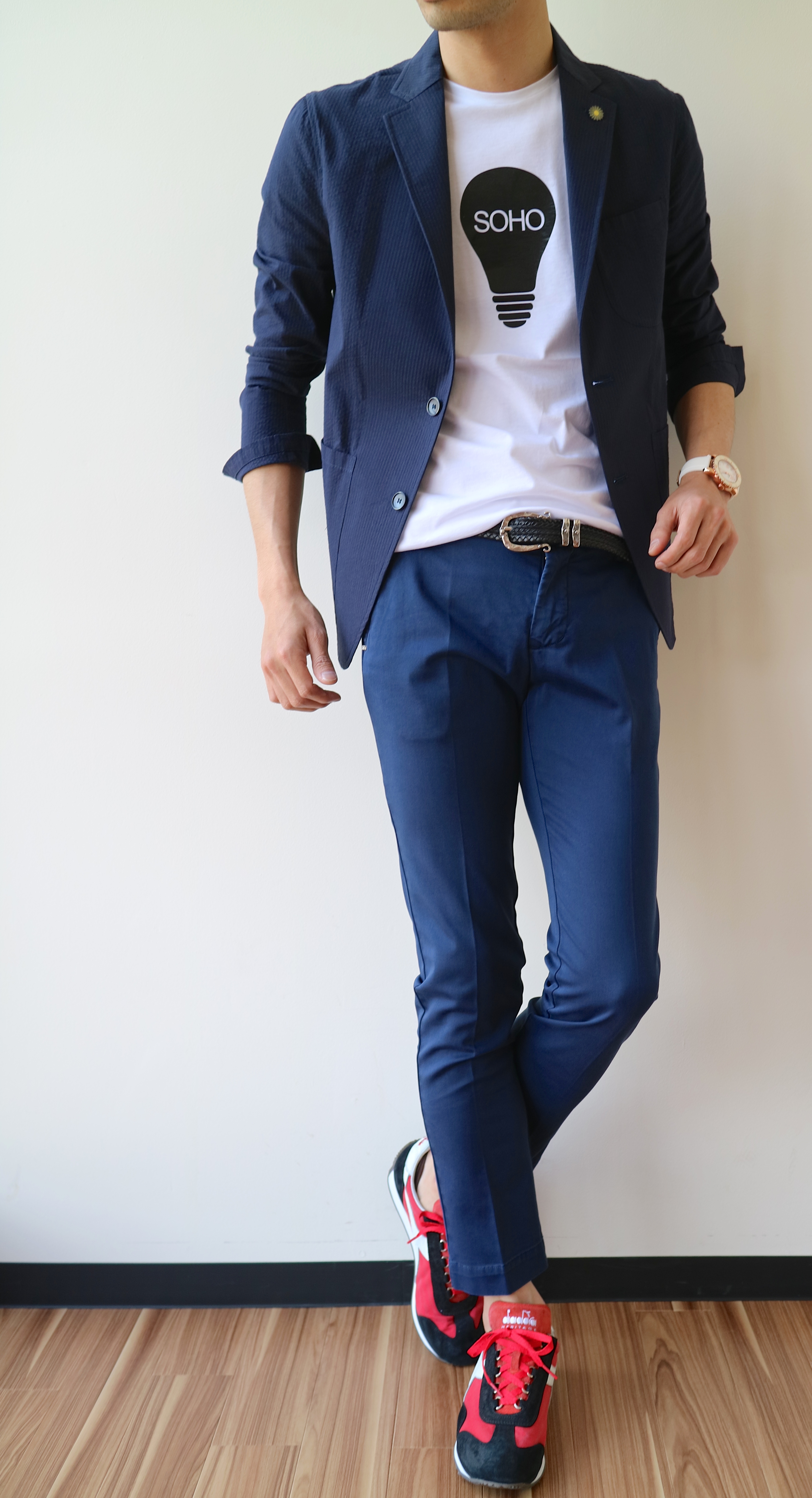 マガジーノスタッフのスグルJr.が今欲しいアイテム...でコーディネート。Giannettoのシアサッカーシャツジャケットに、パンツはentre amisのGaGa。どちらもネイビーですが、中に白を挿すことで重たく見せません。TIBERIO FERRETTIのメッシュベルトに、足下にはdiadora HERITAGEのフェラーリレッドを合わせています。