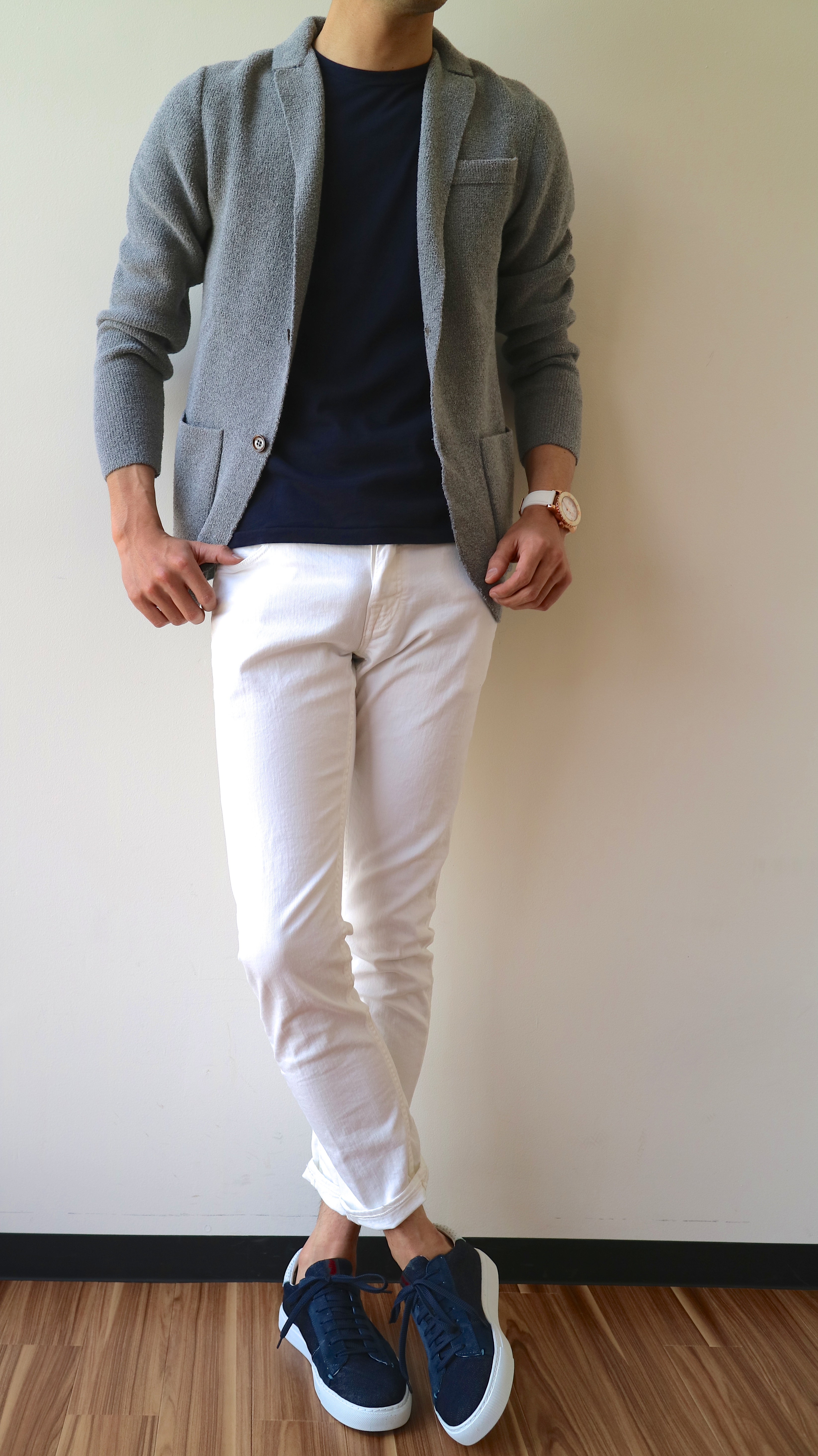 その他、パンツにはCare labelのホワイトテイパードデニム、靴にはWally Walkerのデニム地スニーカーを合わせています。