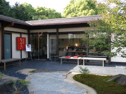 手水で清め、拝殿でお参りをしてから、すぐ隣にある「余香殿なおらい」で一休み。入ると右側に「ショップなおらい」があり、現在、井伊直政家臣の「赤備え」甲冑が展示されています。入り口をまっすぐ進むと「なおらいカフェ」があり、クラシックの流れる、とても落ち着いた雰囲気。大きな窓越しに見る新緑の美しさ。中庭には古木の梅があり、なんとも贅沢な空間です。