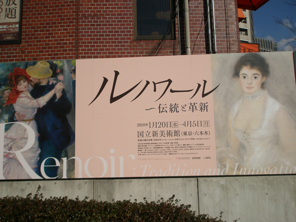 今回の出張は、少しのんびりです。レディースの展示会が主で、家内と二人。最初に出向いた展示会の場所は、乃木坂。早めに切り上げ、すぐ近くの新国立美術館へ。今、館内では「ルノワール伝統と革新」展を開催しています。「ルノワールの旅」「身体表現」「花と装飾画」そして「ファッションとロココの伝統」の4つの章に分かれていて、これほど多くのルノワールの作品を見るのは初めてです。「団扇を持つ若い女」や「アンリオ夫人」など、とても柔らかな筆使いの愛らしい女性像、「ヴェールをまとう踊り子」や「水の中の娼婦」などの豊麗な裸婦像。そして大好きなルノワールの作品、「花瓶の花」「縫い物をする若い女」も展示してあり、ルノワールの世界を満喫して来ました。20日からの開催で人出も多かったので、もう少し落ち着いてきた頃に、もう一度見に行こうと思っています。ちなみに4月5日まで開催されています。