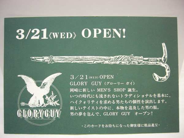 今から、ちょうど20年前の今日、平成2年3月21日に【GLORY GUY】は、男の夢を包んで、オープンしました。このダイレクトメールは、その時に出した案内状です。場所は、ここ竜美丘ガーデンプレイスではなく、欠町の東公園東隣、大通りから入った住宅地。人目に付かない12坪ほどの小さな店。その場所が、グローリーガイの生まれた場所です。そして、その5年半後に、この場所に移転して、今日で20歳を迎えました。31歳だった私も、51歳になり、20年の月日は、あっという間でもあり、長く重くも感じられます。振り返れば、懐かしさと感謝の気持ちで胸がいっぱいになります。多くの出会いに感謝します。そして、心よりお礼申し上げます。
