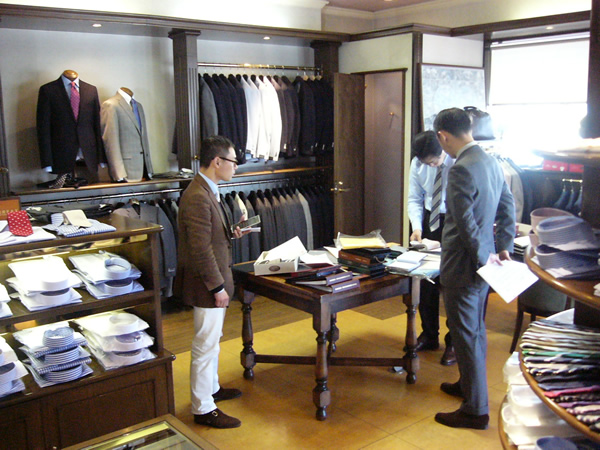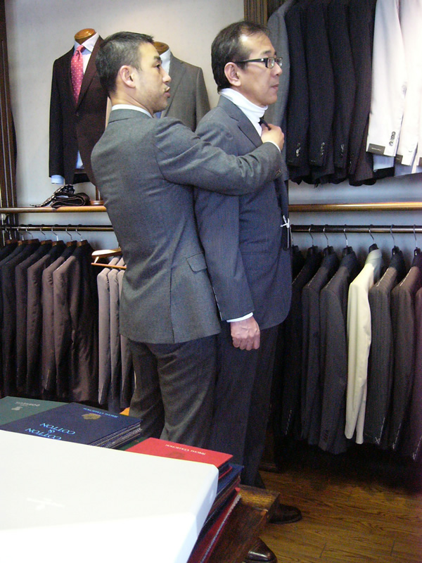 実は、この日、最も輝いていたのは、スタッフの名倉です。彼は既製品が体に合わない為、スーツ、ジャケットは全てオーダーに頼らないといけません。その為、この日の来ることを待ちわびていて、生地が届いてからは、暇ある毎に目を輝かせ、生地に見入っていました。今回、彼は、DRAPERSの生地を選び、2着のジャケットをオーダーしていました。しっかり、お客さんになっていましたね。私は、以前より必要としていたブラックスーツをウィリアムハルステッドの生地でオーダーしました。私の場合は、既製品で充分、間に合うのですが、胸囲に対しの肩周りとウエストに対してヒップ周りが貧弱なので、そこの調整をし、また、パンツにサイドストラップを付けるなどデティールにも拘りました。