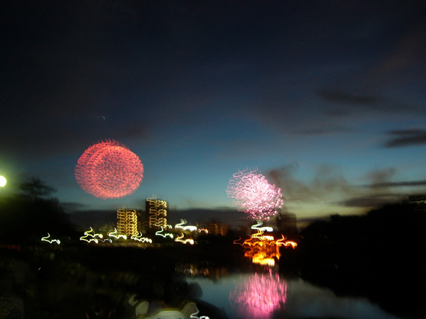 夜空に咲く花のように華やかで、とても綺麗でした。昨日は、岡崎観光まつりのイベント、花火大会が行われました。徳川家康時代から続く三河花火の伝統と技が、この日、夜空に舞い上がり、私達を愉しませてくれました。開催時間は、19時。次第に盛り上がる花火の音に我慢できず、自転車で近くの橋の袂まで行くと、既に浴衣姿のカップル、家族連れなど多くの方で賑っていました。子供が大きくなってからは、こうしてじっくり花火を見るのは久しぶり。ずっと、見ていたい気持ちになります。閉店間際に戻り、写した写真を確認すると、唖然としました。カメラが悪いのか、腕が悪いのか、たぶん両方でしょう。こんなことなら、カメラが趣味だった父親から、きちんと教えてもらえばよかったと後悔です。腕の悪さをカバーできるカメラを買わないといけませんね。ただ一枚だけ、芸術作品がありましたので、載せます。この写真、撮ろうとしても撮れません、と思いませんか?