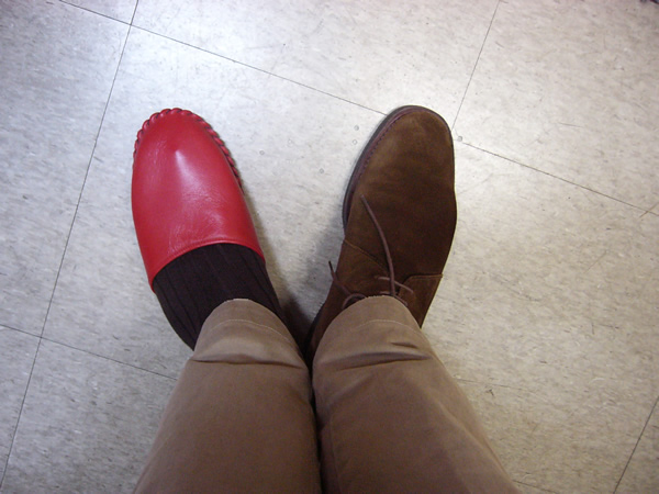 以前、お話した私の踵にできたイボ(魚の目)は、未だ直らず。直るどころか、ますますひどくなっていくようで、年明け早々の出張が心配です。踵をかばう為に、どうしても反対足に負担がかかります。そのうち腰から首筋までが痛くなり、気分も憂鬱です。売り場に出ないわけにもいかず、昨日からスリッパを履いています。お客様には大変、失礼に当たるのですが、やむを得ません。「何を履いても似合うね。」と褒めていただけるお客様には感謝です。