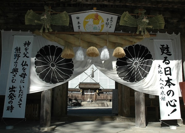 上の写真は、熊野本宮大社の神門です。熊野本宮大社は、熊野三社の一つで「紀伊山地の零場と参拝道」の一部として世界文化遺産に登録されています。その神門には長さ4.5メートル、重さ250キロの大しめ縄と大絵馬が。そして今年から、大絵馬の両側に「やた烏しめ縄」が飾られています。実は、この「やた烏しめ縄」を制作、奉納されている方が浅井氏なのです。