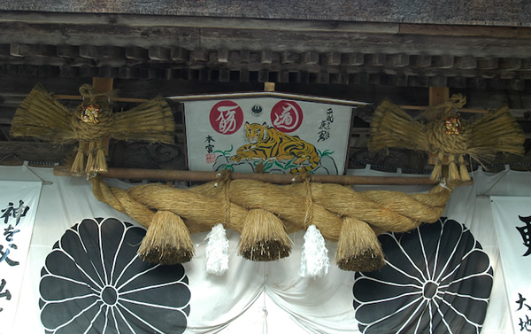 そして、「やた烏しめ縄」の真ん中には、今年の干支「寅」が。一年間、熊野本宮大社の神門で参拝者を見守ってきた干支「寅」の飾りを今回、お持ちいただいたのです。こんなにも近くで見ることができるなんて・・・。思わず触ってしまったほどです。本当に、浅井氏の才能に感動、感謝です。