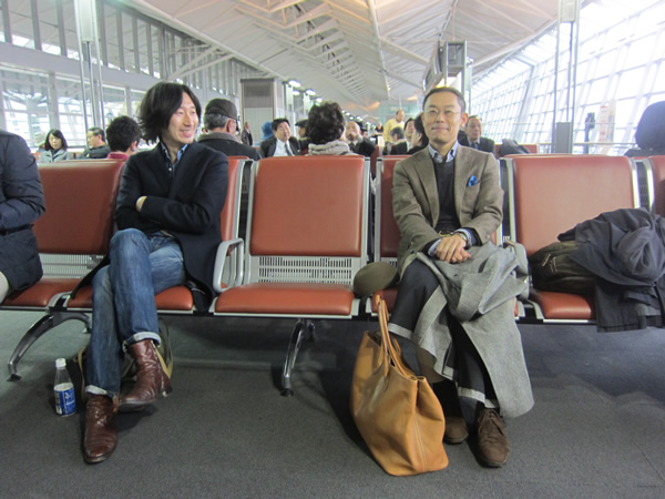 慰安旅行ではなく、展示会に行くような二人の出で立ち。ただ、いつもと異なるのは場所が空港ということ、そして笑顔。ただ気になるのは、この距離感です。椅子を一つ空けて座るところなんぞ、彼らの人間関係が良く分かるというものです。