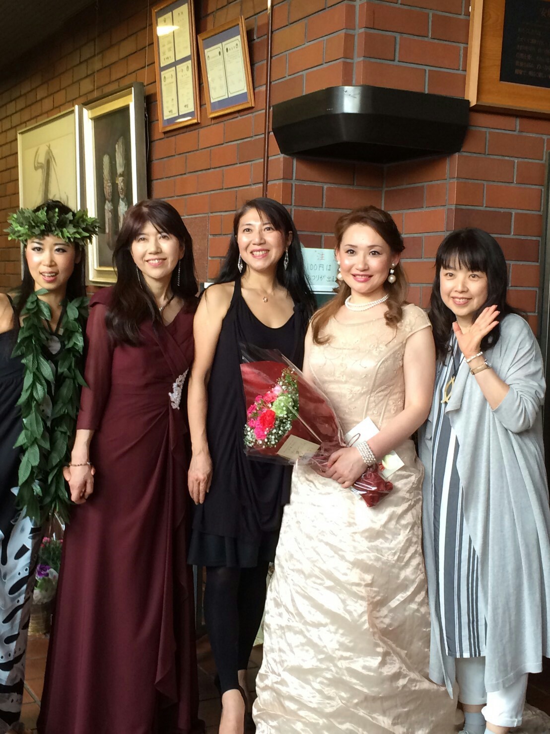 終演後の写真撮影です。左からフラ振り付け師でダンサーの瀬尾幸恵さん、妹でピアニストの村主真裕美、今回のリサイタルを主催した「あたたかい会」代表の村岡千佳さん、そしてオペラ歌手の加地早苗さん、一番右は「カシェート」オーナーのよしのさん。皆さん、美しく魅力的な女性ばかりです。