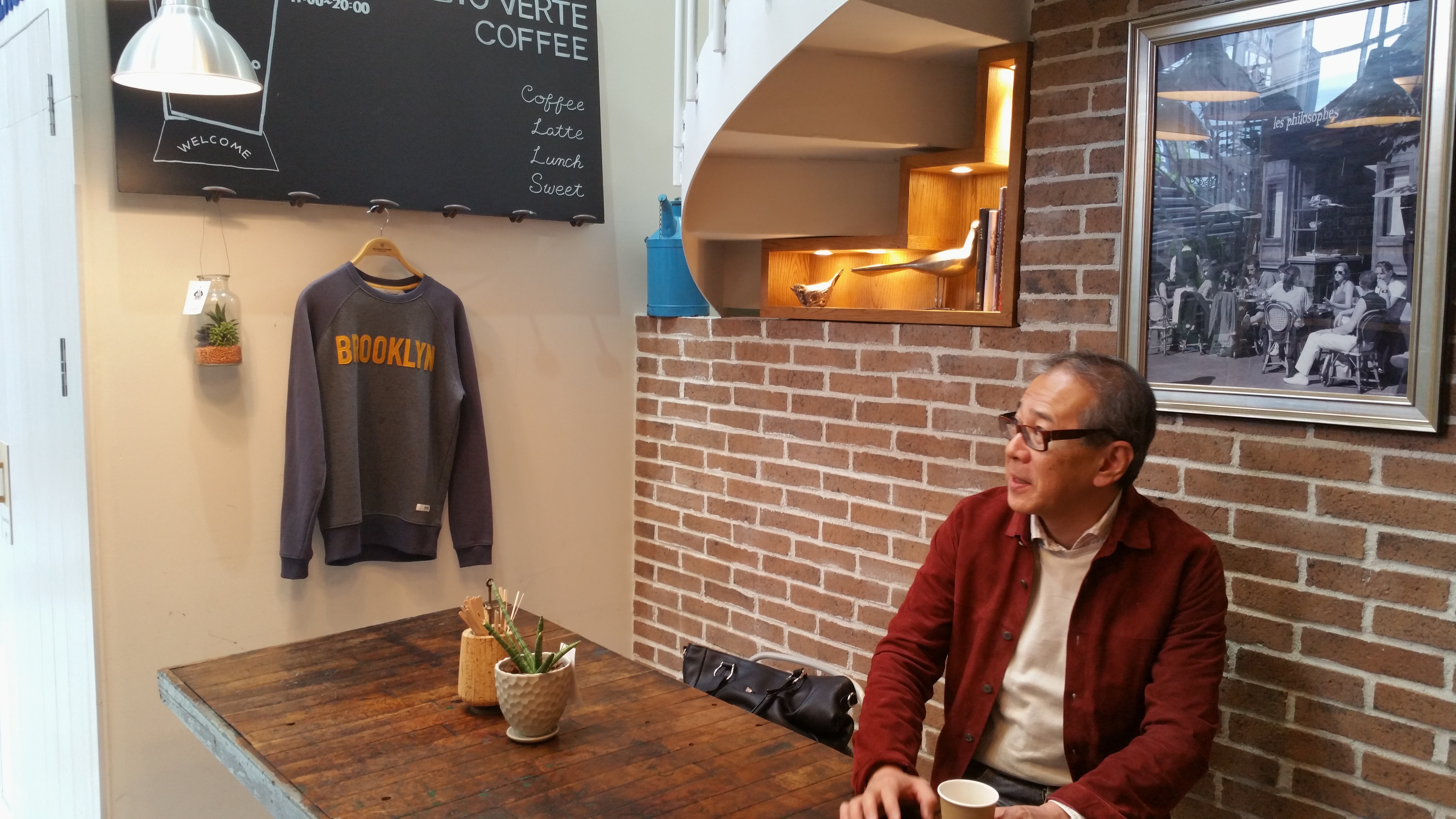 初めまして、スグルです...ではありません。長年のお客様には見飽きた顔です。絵になるからって煽てられて写真に収まった場所は、すぐ隣りのワークスタジオ内のカフェ。ただ気になるのは視線。この先にあるのは、ナノユニバースさんやや鎌倉シャツさんの入る2階へと繋がる階段。きれいな方を見ると、ついつい目で追ってしまうのは、男の性(さが)というものです。そして今日も着ているヴァッツォレールのレザーシャツ。いかに気に入っているかがお分かりいただけるでしょうか。ここ最近、落ち着いた色目が多い中、一際目を引くワインの艶に嵌っているのかもしれません。そろそろ色が恋しい年頃、いや季節ですね。
