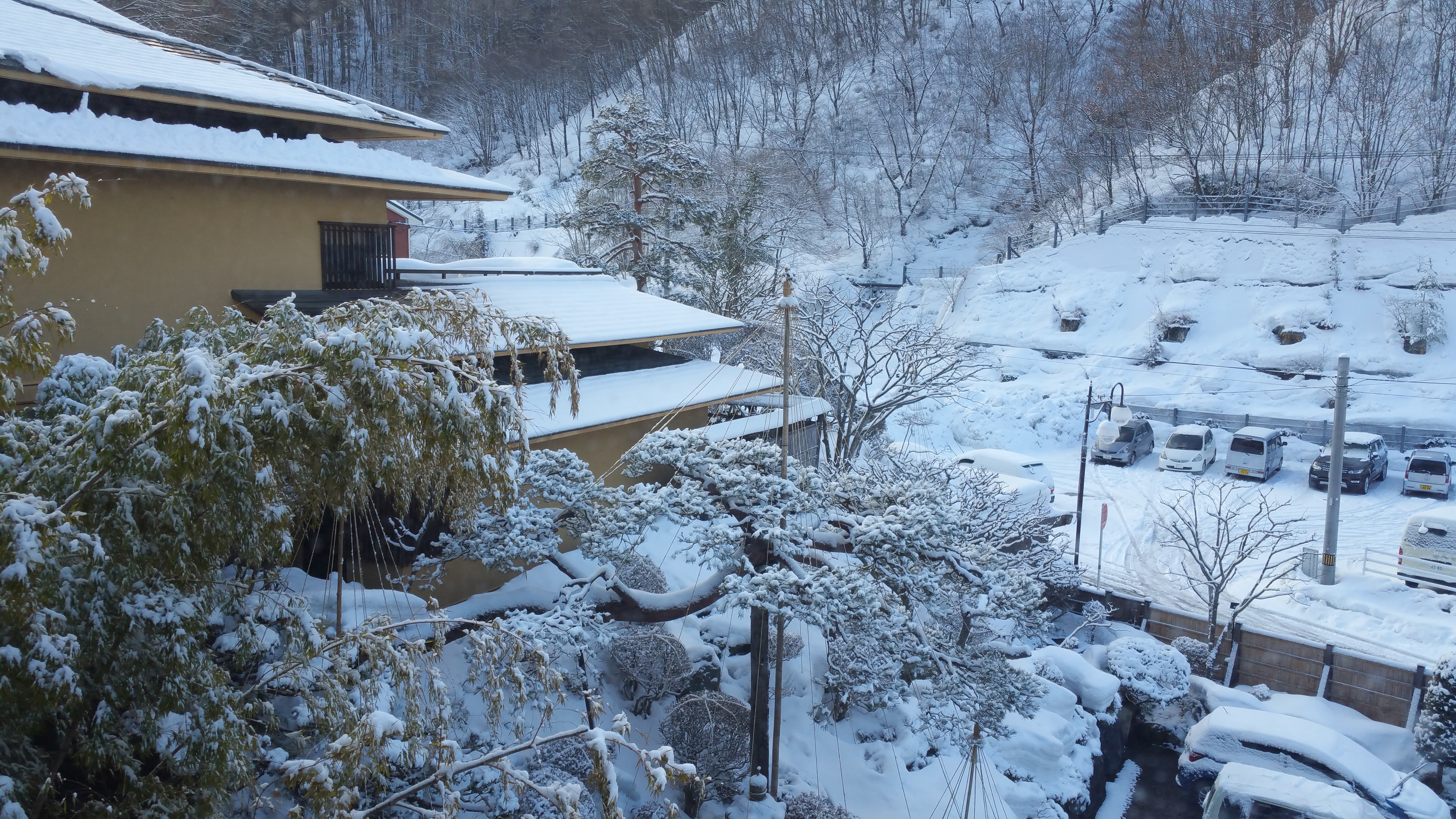 昨日の午後から降り出した雨は、徐々に白くなっていき、周りを雪景色に変えていきます。夜中、どさっと落ちる雪に初めは驚いておりましたが、前日一睡もしていなかっただけに、いつのまにか記憶喪失。目が覚め、窓から見える雪国の美しい景色に見惚れます。朝食前にひとっ風呂は日本人の常識。今日一日素敵なことがありそうです。