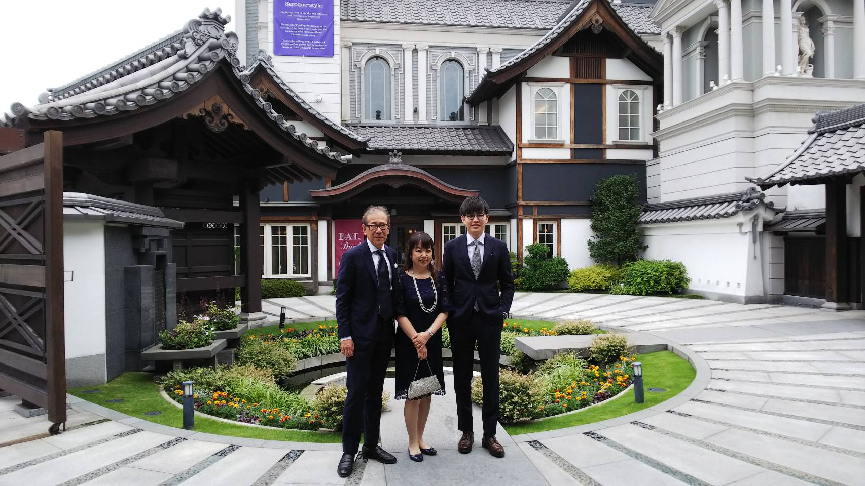 中庭で記念写真です。我が家は、皆、ネイビー系で統一して参列します。モーニングやディレクタースーツ以外、ブラックは着ません。私が選んだスーツはStile Latino/スティル ラティーノ。やや明るめのネイビーブルーで華やかです。ネクタイは濃紺のサテン無地でVゾーンを引き締めます。上さんもカシェートで購入のネイビーのワンピース。ジュニアは、この日のために新調したDe Petrillo/デ ペトリロのモヘア混ネイビースーツ。深みのある濃紺です。ネクタイはシルバーを合わせました。