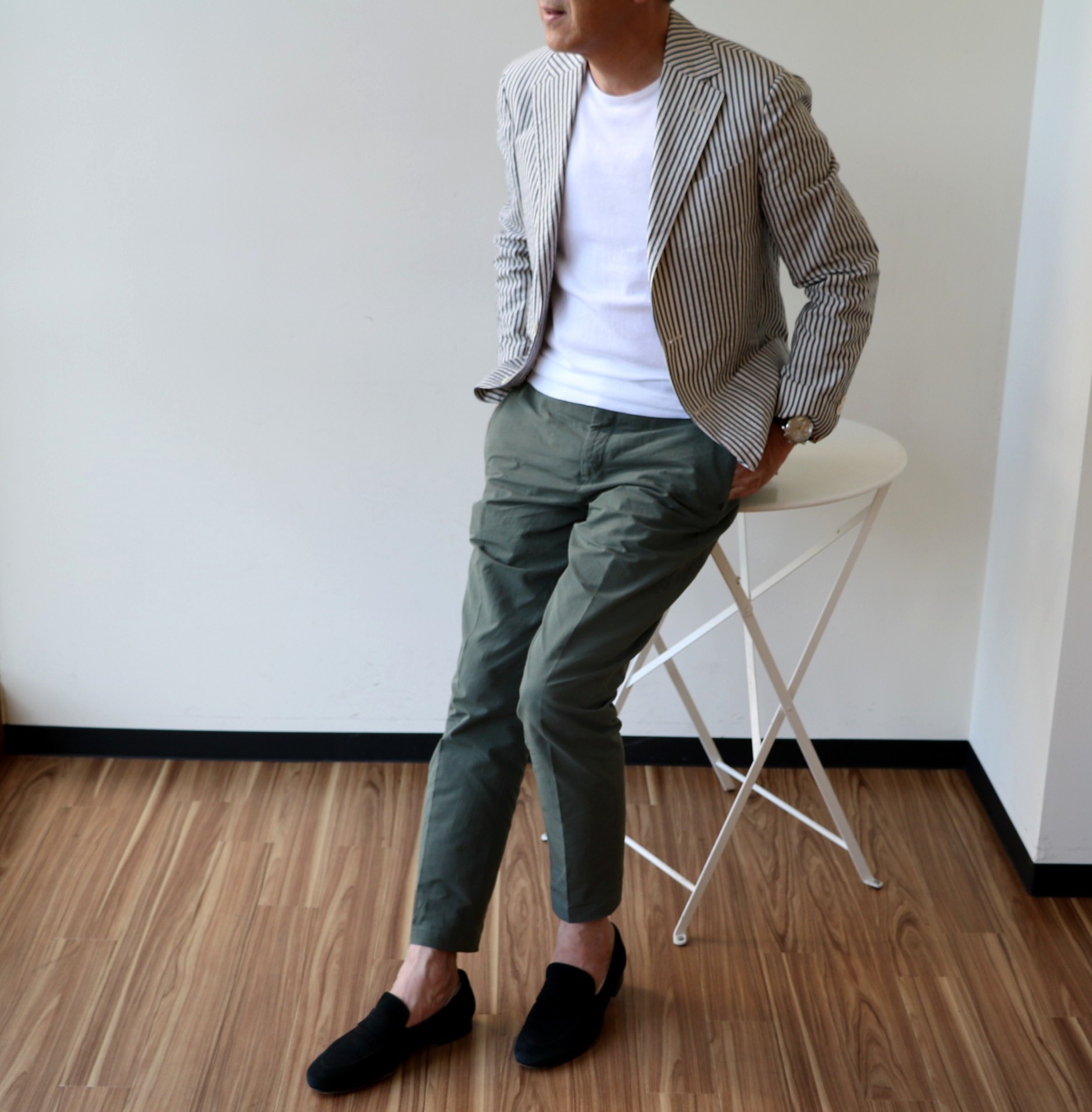 本日の出で立ちではありません。花金に行われる"オトコのフラレッスン"。レッスン前の一コマです。スポーツウェアを持っていない私は、この日、選んだのは、数年前に購入したZANONE(ザノーネ)のアイスコットンTシャツ。パンツはファーストシーズンで展開していたVIGANO(ヴィガーノ)のドローコード付きです。レッスンが終わった後、そのまま街に繰り出せるのですが、この時期、かなりの汗はかきます。面倒臭がらずに、着替えます。