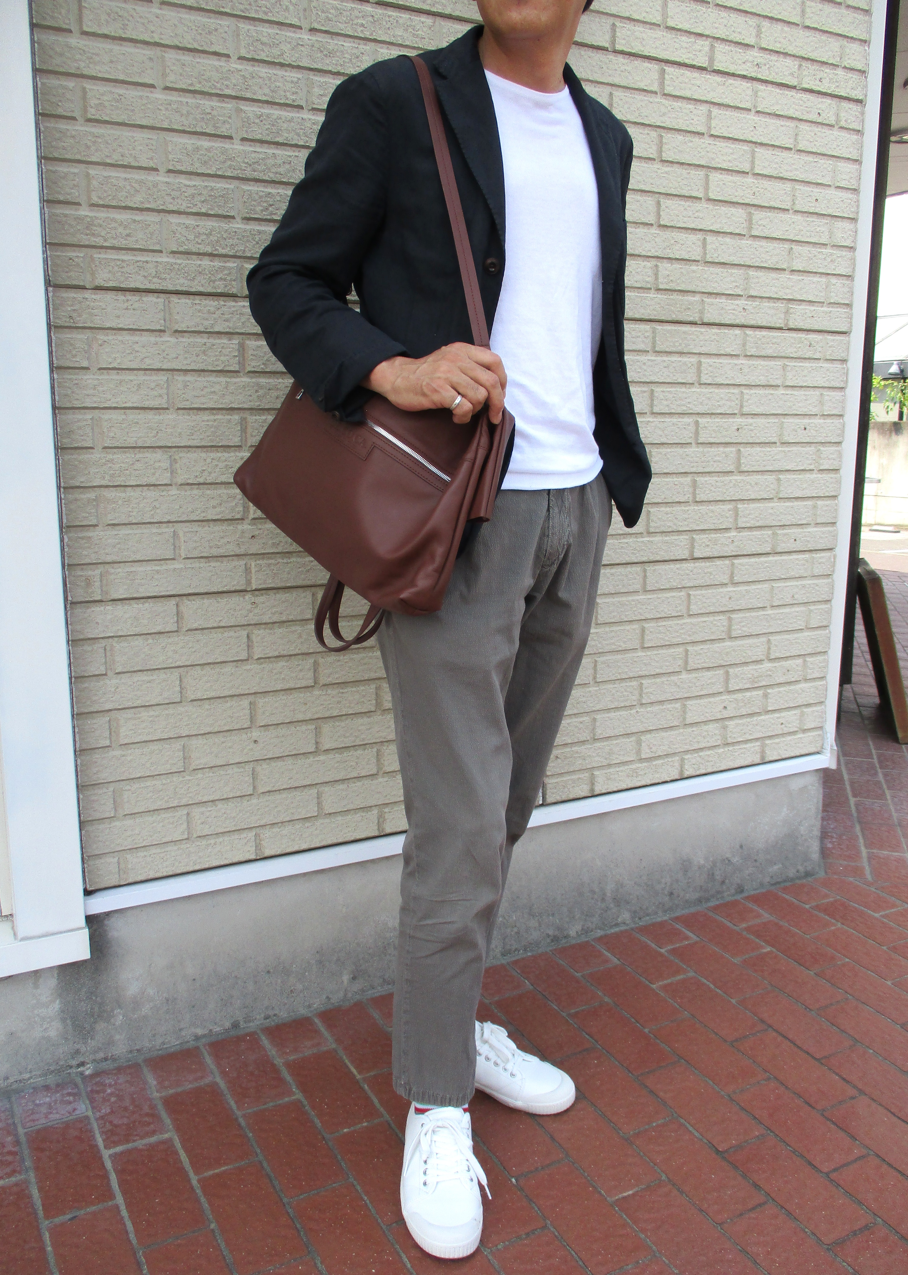 普段、使っているのは、黒のトートバッグ。ブラウンのバッグが欲しいと思っている矢先に展示会で目に留まったのが、このブランドなんです。持ち方は、様々ですが、個人的には、こんな持ち方が好きです。