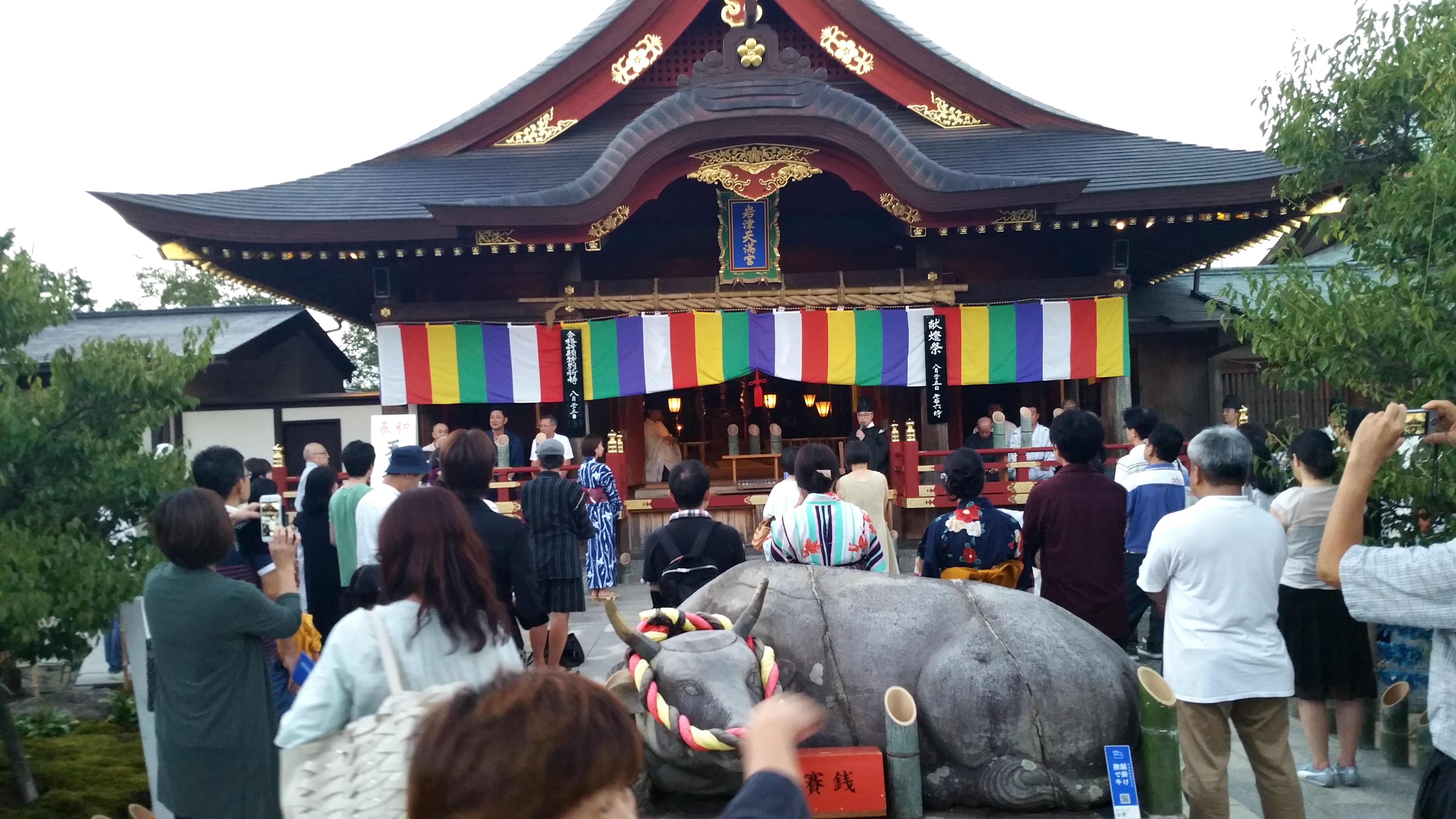 6時少し前、私達は拝殿の中で御払いを受けました。終わって、外に出ると境内は参拝者の方々で埋め尽くされています。浴衣姿の女性も多く、その中には家業の花火製造が忙しく、夏の間、休みを取っているイナガキさんやジュニア夫婦など知り合いの姿もちらほら。緊張感は高まります。