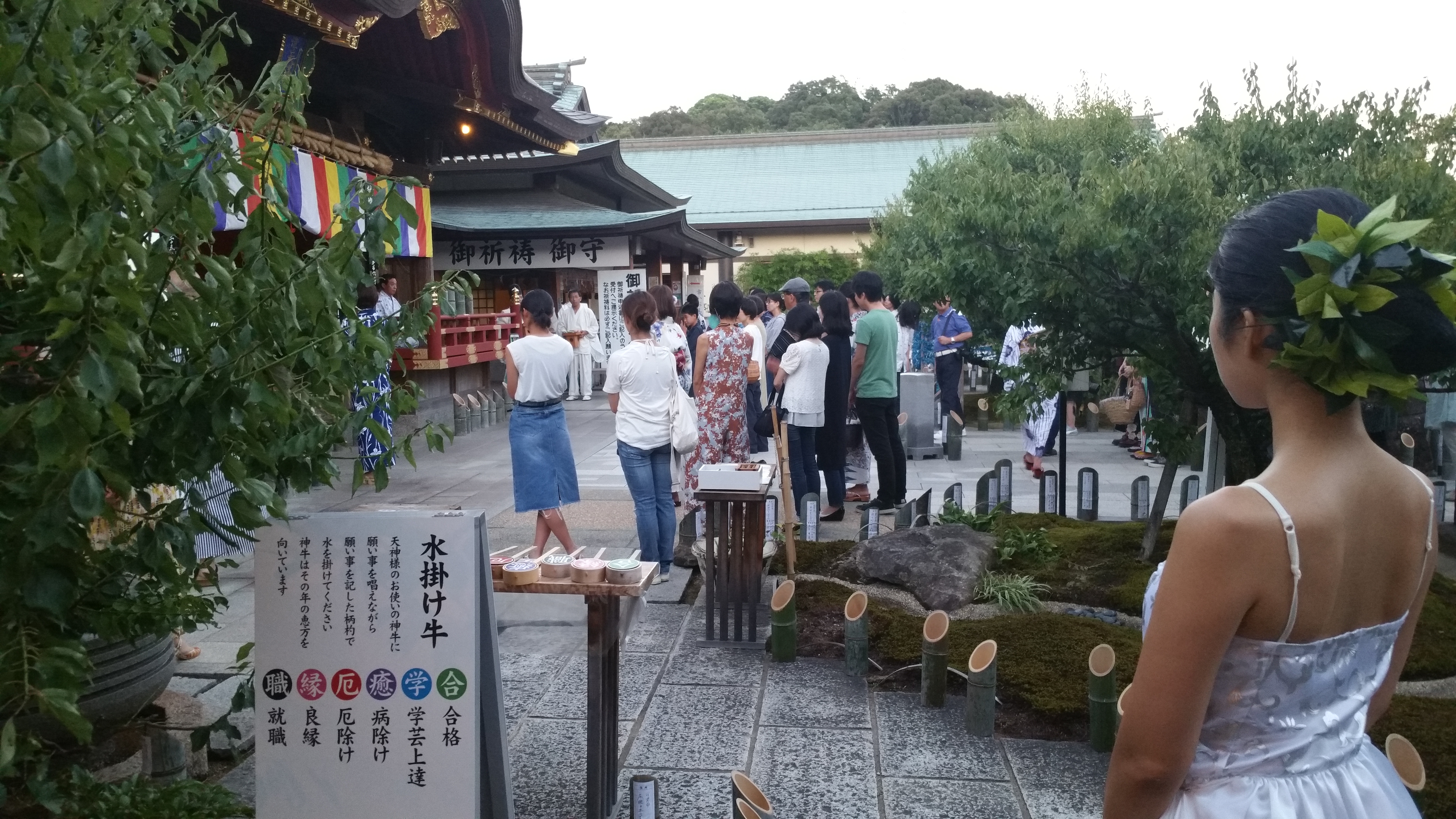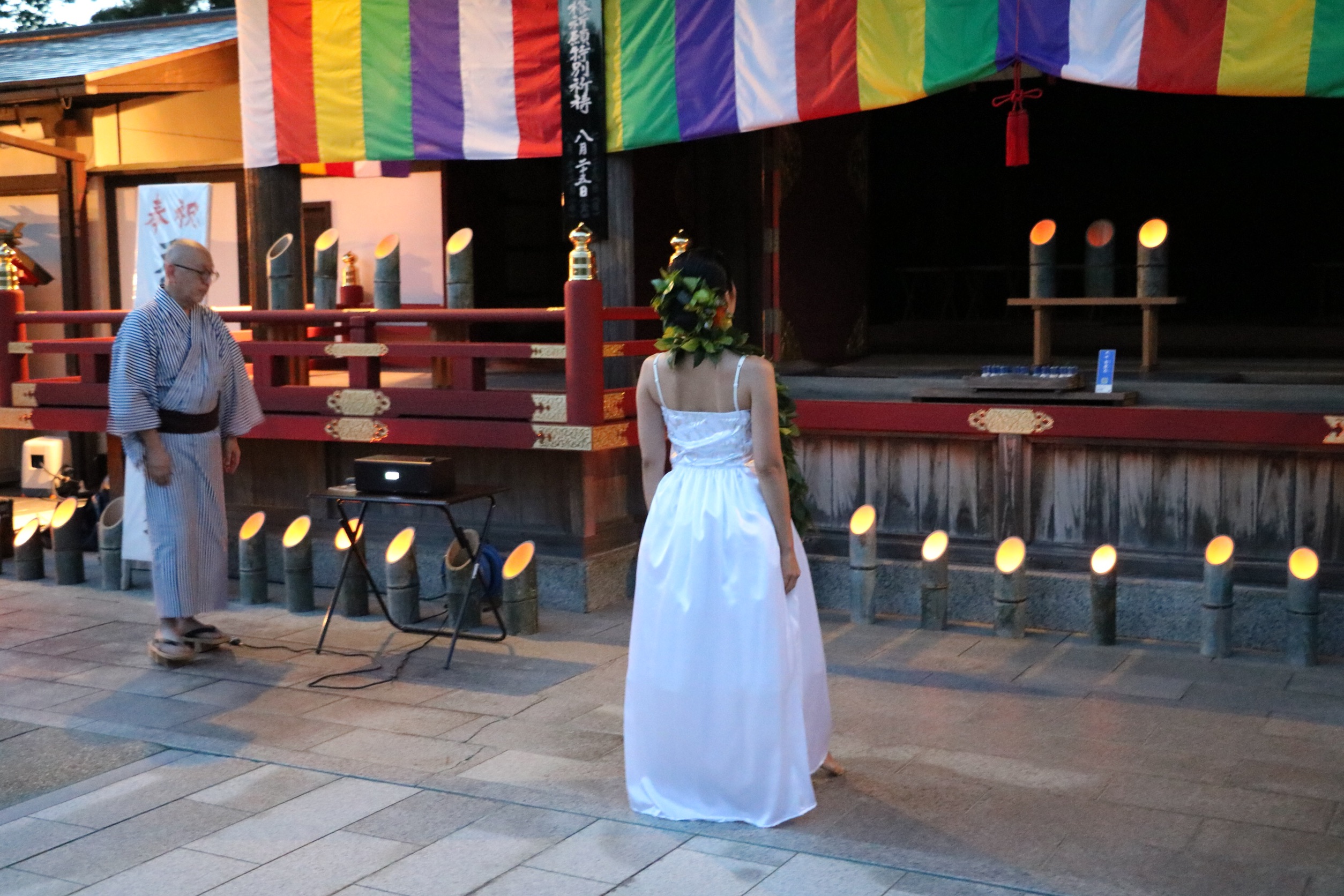 衣装に着替え、出番を待つ私達。まだ明るさの残る境内。蒸し暑さのせいか、緊張の高まりなのか、汗が吹き出ます。