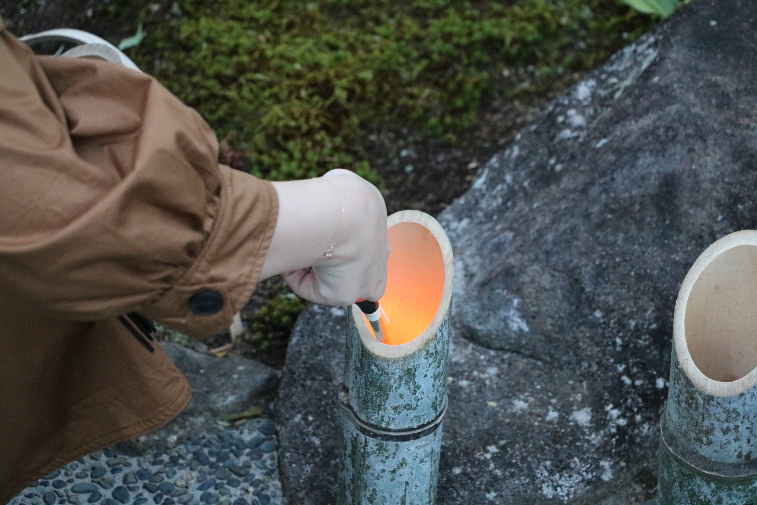 宮司さんの挨拶が終わると、境内に並べられた竹雪洞に灯りが燈されます。