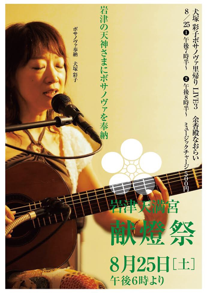 ちょうど一年前の写真です。花金のオトコのフラ教室を野外研修に変更し、訪れたのが、岩津天満宮さんの「献燈祭」。お参りをした後、本殿横にある"なおらいカフェ"でボサノヴァライブを楽しみました。