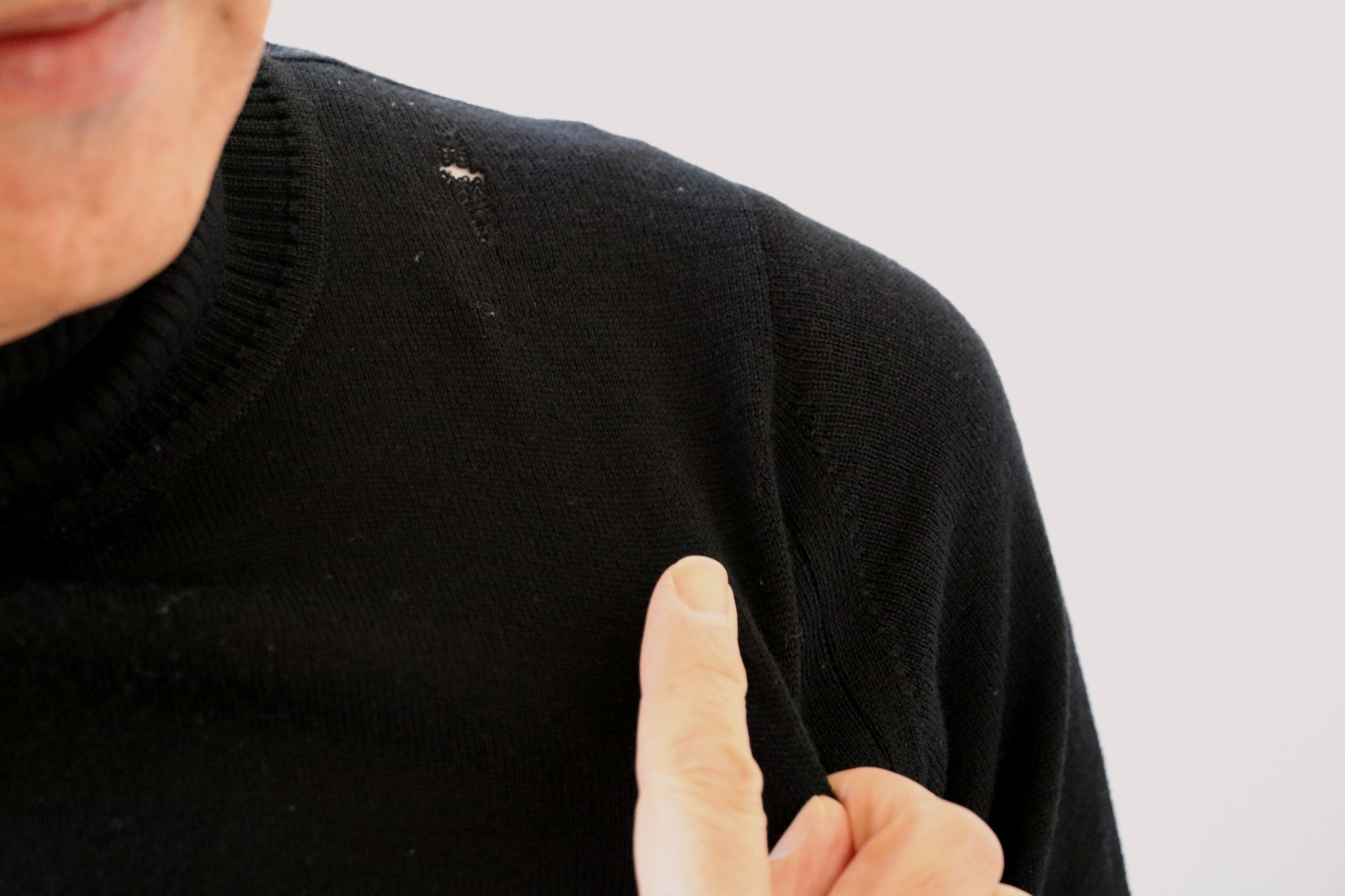 中に着ているのは、JOHN SMRDLEY(ジョン スメドレー)の24ゲージのタートルネック。ただ写真のように、穴が開いています。たぶん虫食いでしょうね。見つけたのは、少し前。まだ5.6年ほどしか着ていないのに...。でも大丈夫、修理に出して、また着ますが、問題は今夜。